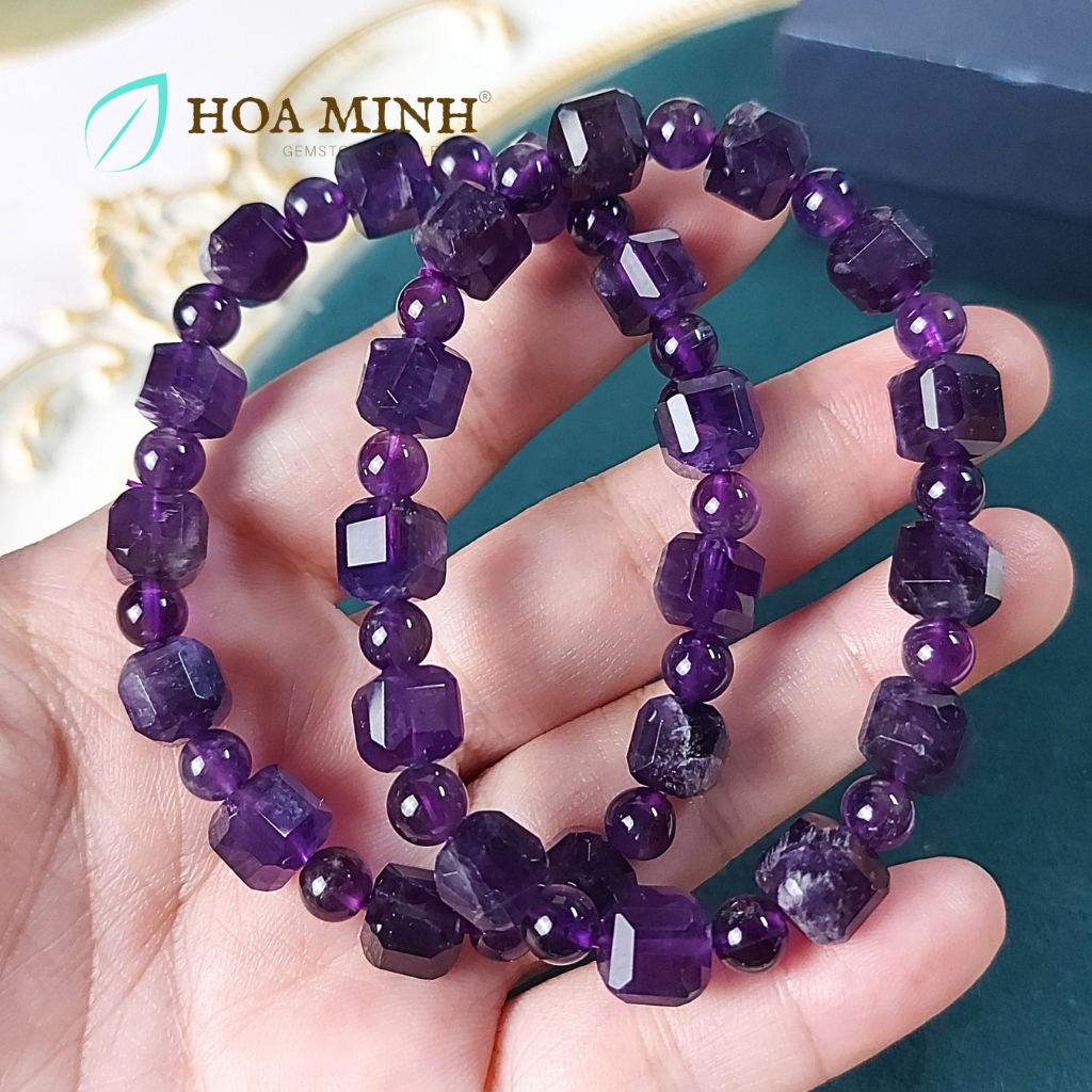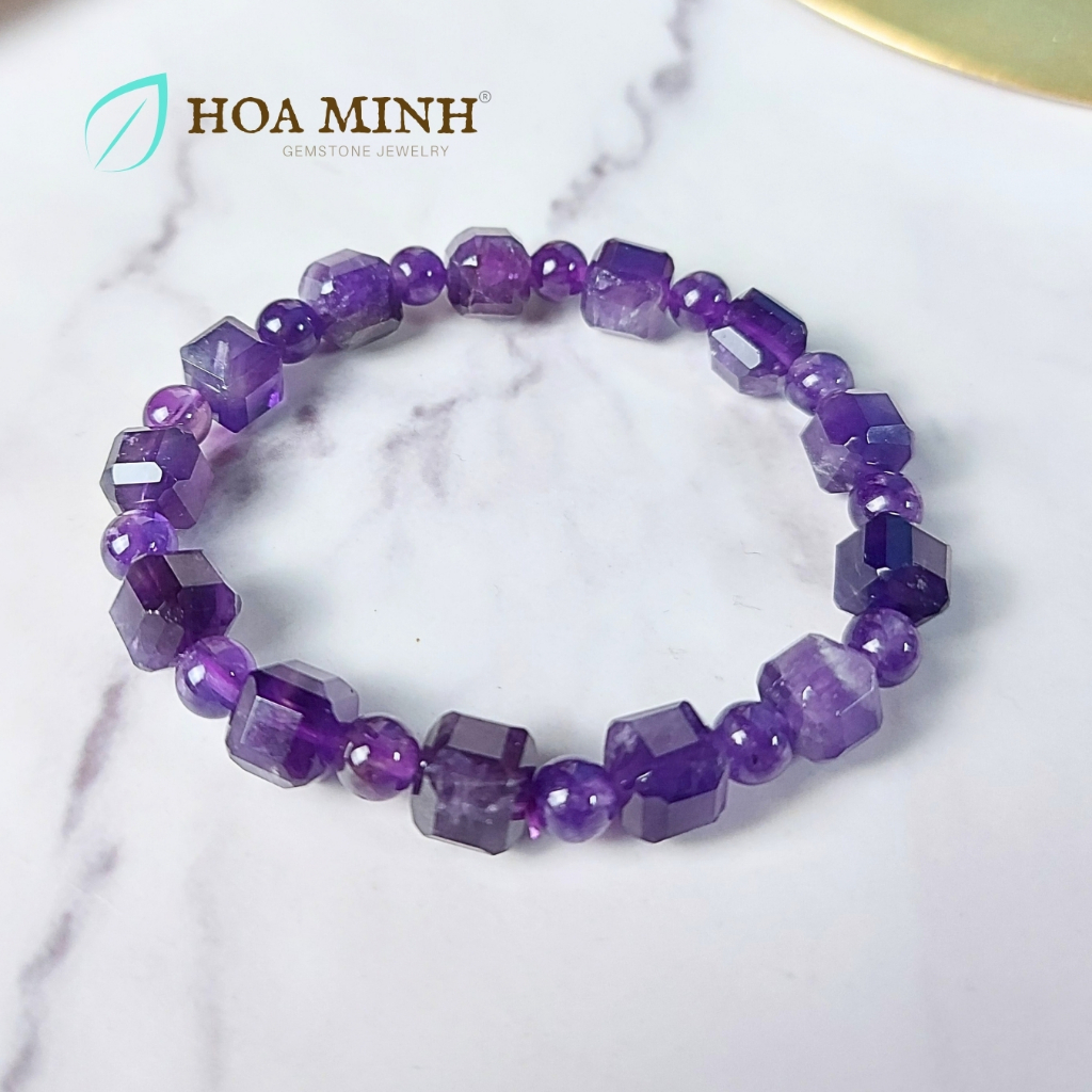 Vòng tay đá Thạch Anh Tím Amethyst tự nhiên size 8 li kiểu hạt vuông cắt giác lấp lánh, phối viên tròn thạch anh tím