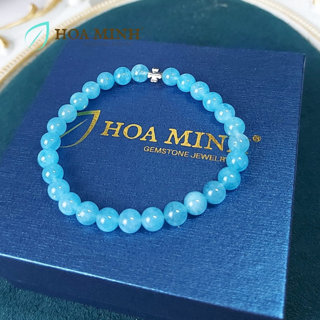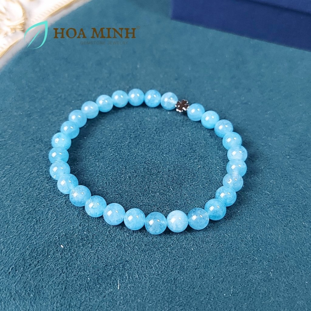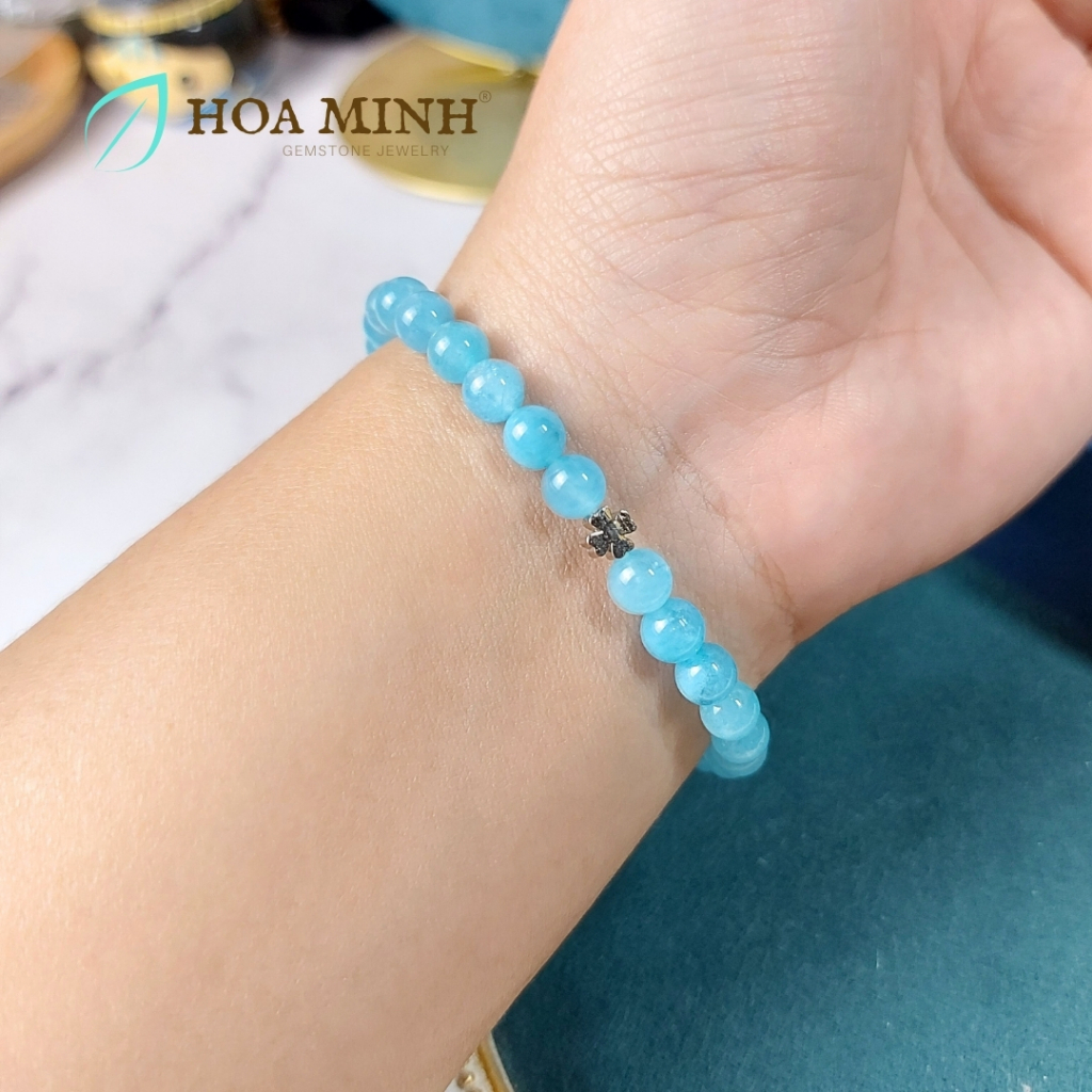 Vòng tay đá Aquamarine size hạt 6.5 li tự nhiên phối charm cỏ 4 lá may mắn phong cách tiểu thư, thanh lịch