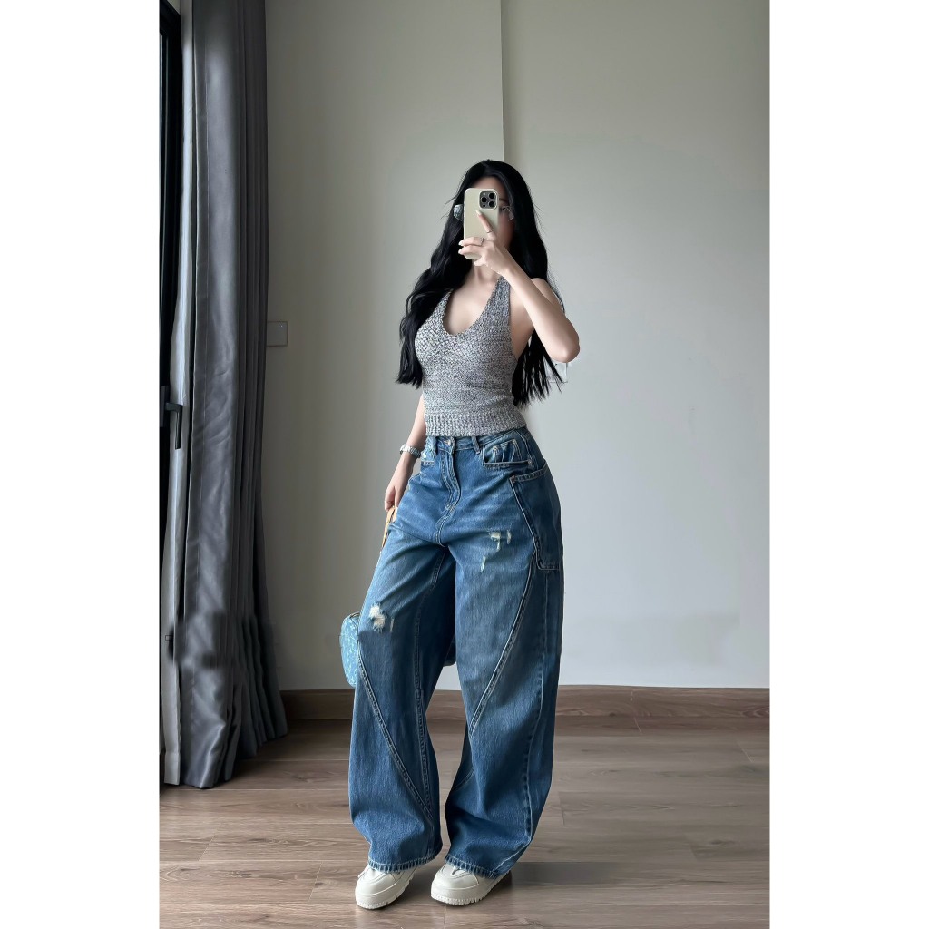 [ORMO2712] QUẦN JEANS ỐNG RỘNG NỮ LƯNG CAO TÚI XÉO GÂN XÉO RÁCH NHẸ MÀU XANH ĐẬM LAI CUOSN CÁ TÍNH HOT HIT