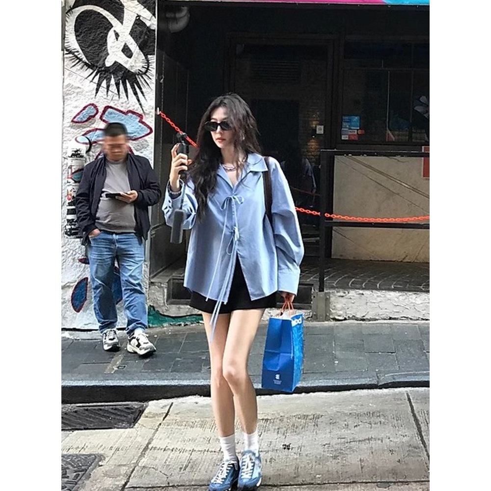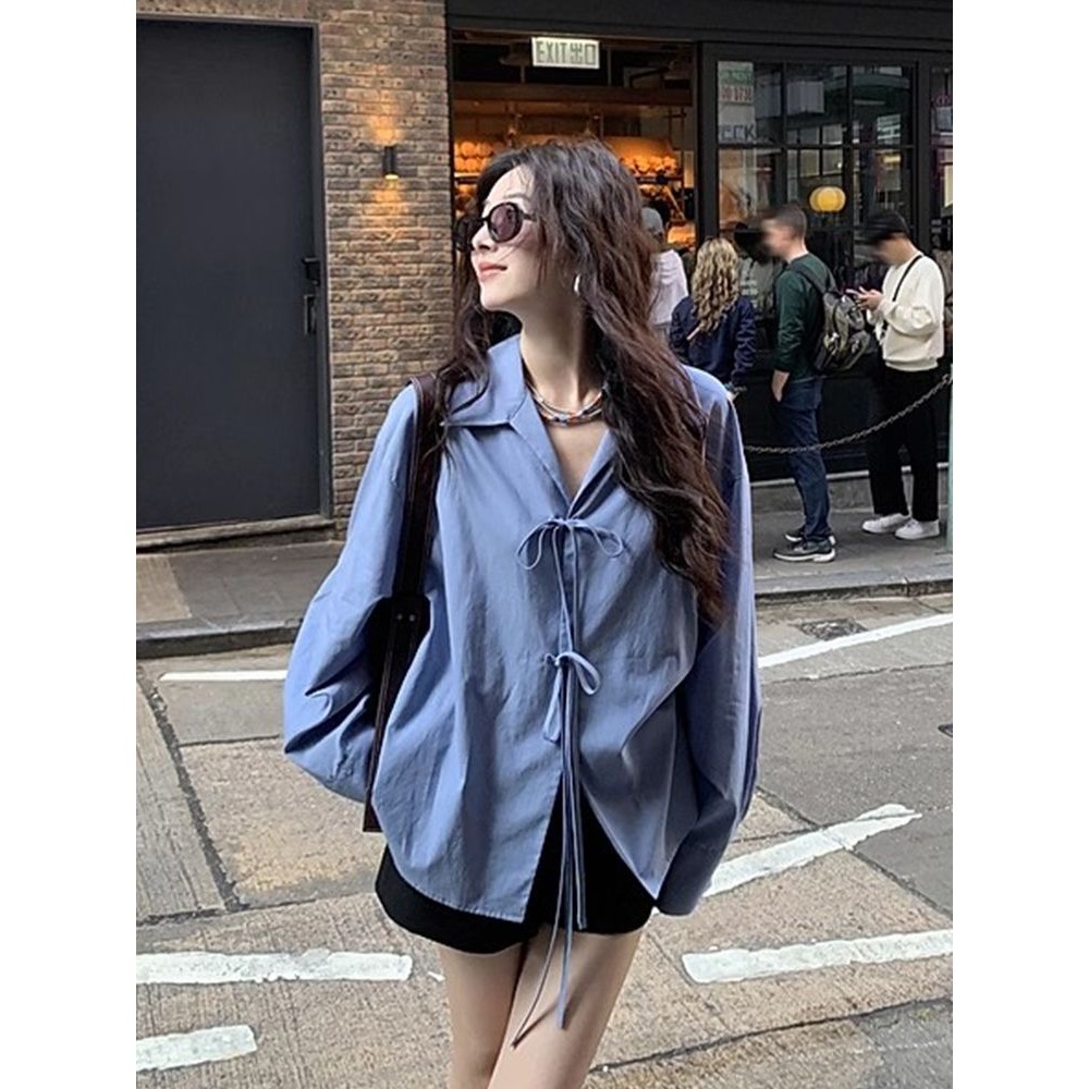 Áo sơ mi dài tay thiết kế xanh đầu xuân phong cách mới của Hàn Quốc, dáng rộng, có nơ giảm tuổi, thời trang cho nữ