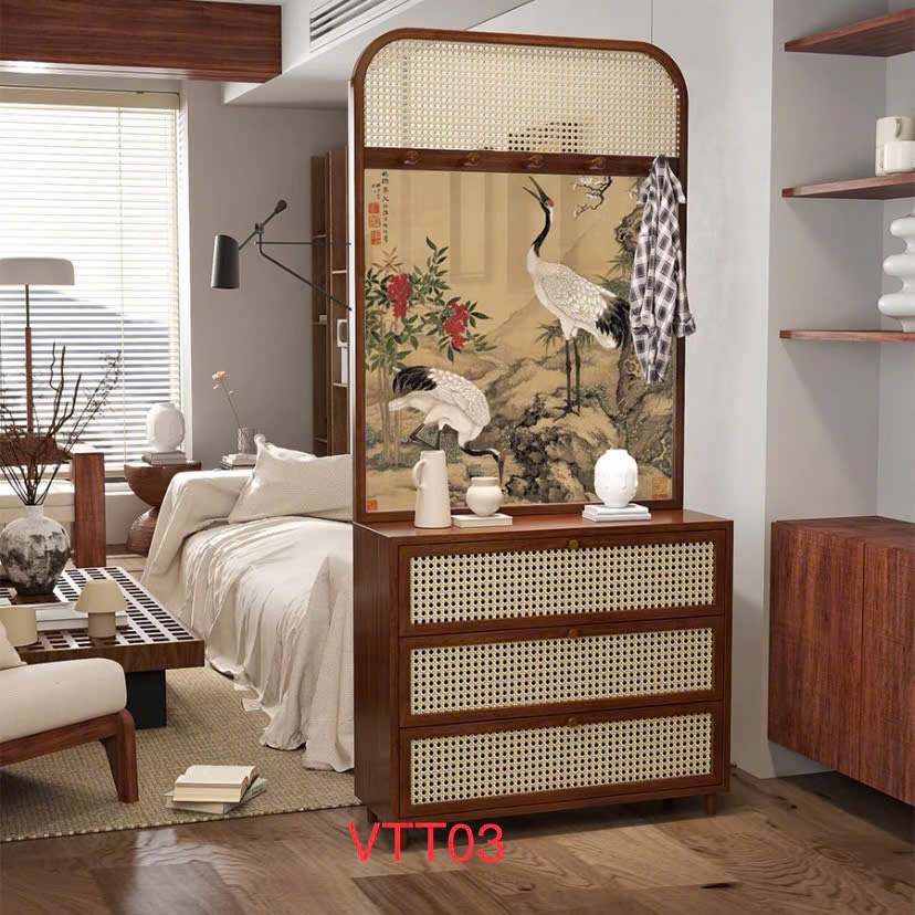 Vách kết hợp Tủ trang trí phòng khách Gỗ In Tranh CNC phối Mây VUADECOR FURNITURE kích thước 100x200cm