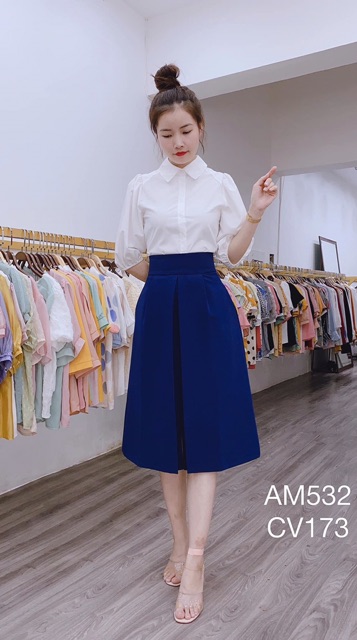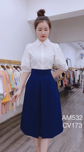 Chân váy chữ A cạp bản to xếp ly giữa váy đến gối