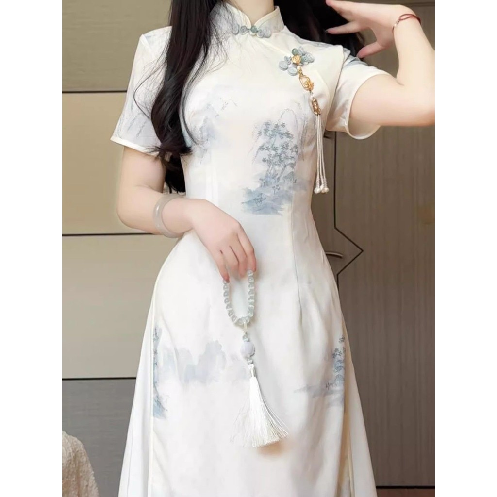 Áo dài mùa hè 2025 kiểu mới Matcha, Qipao in cải tiến, thanh lịch, phong cách Trung Quốc mới cho phụ nữ