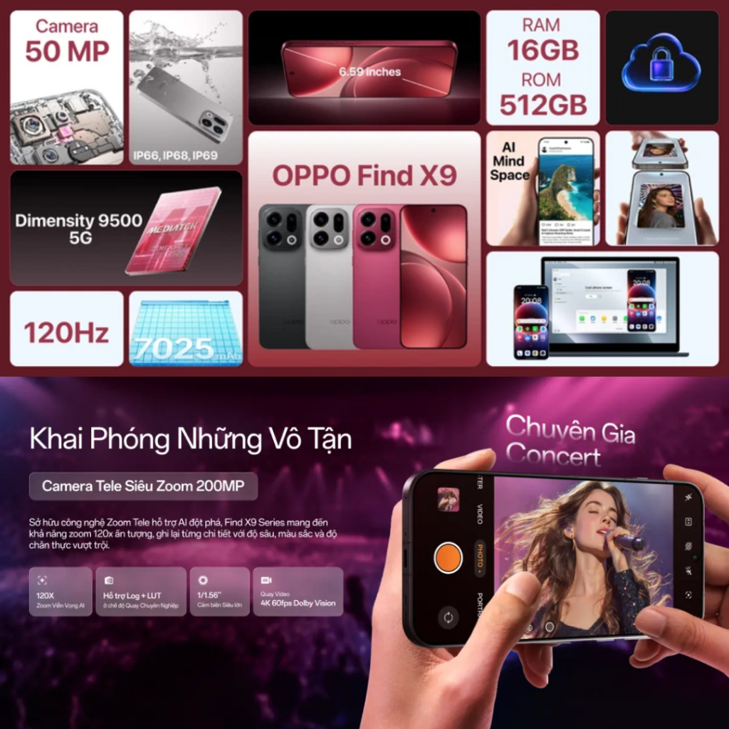 OPPO Find X9 5G (16GB - 512GB) - Chip Mediatek Dimensity 9500, Pin 7025mAh - Hàng Chính Hãng - Bảo Hành 24 tháng