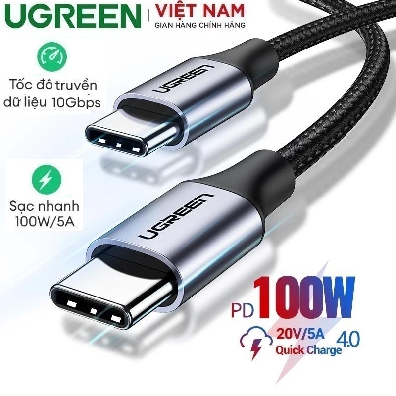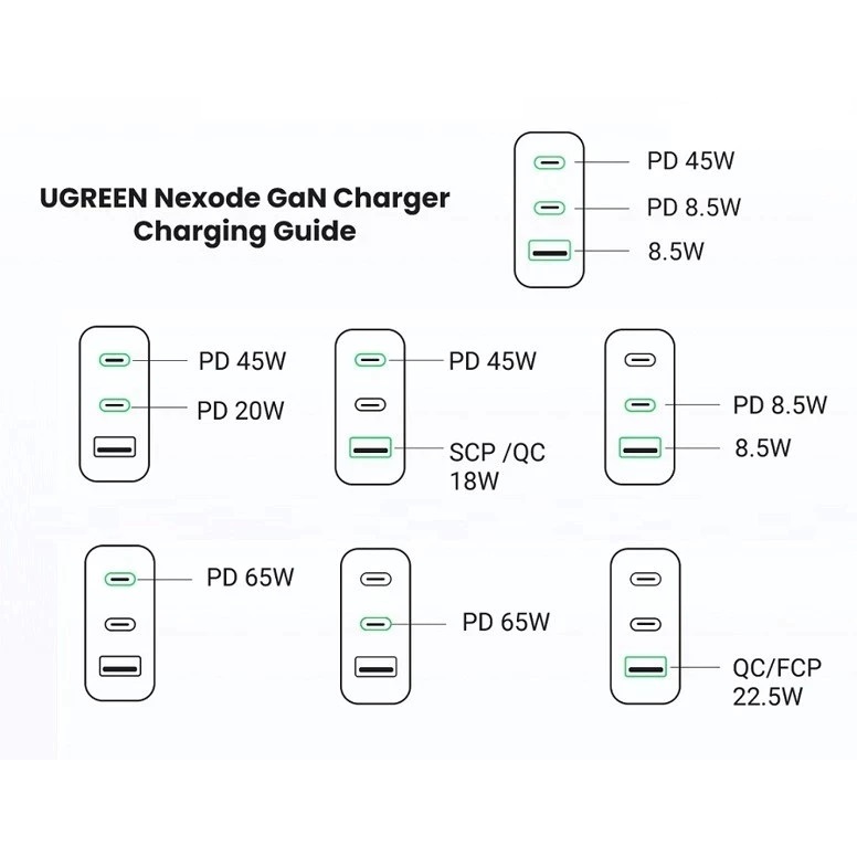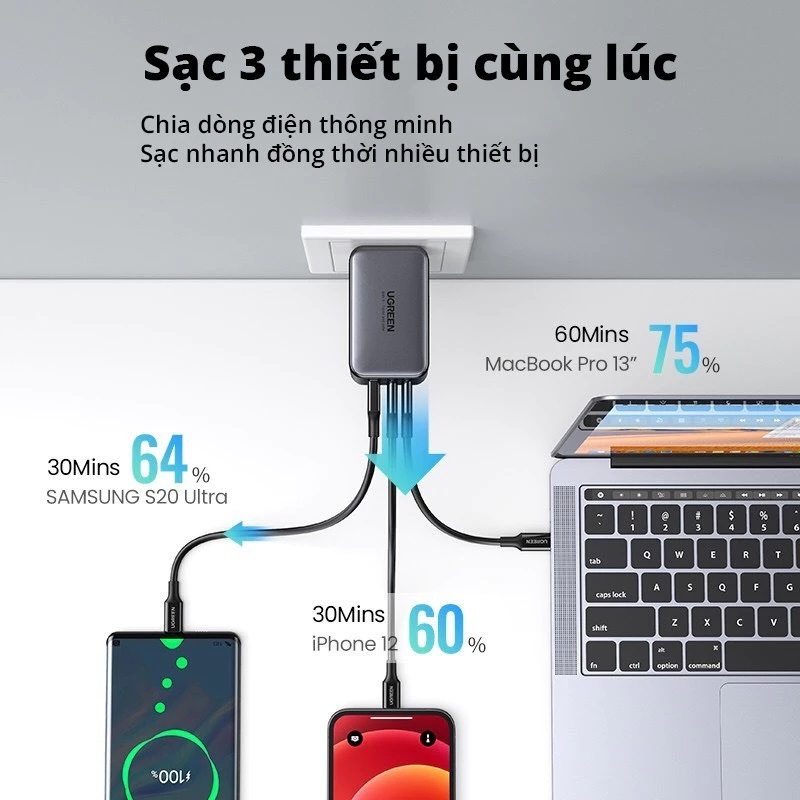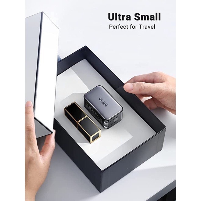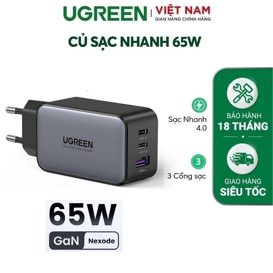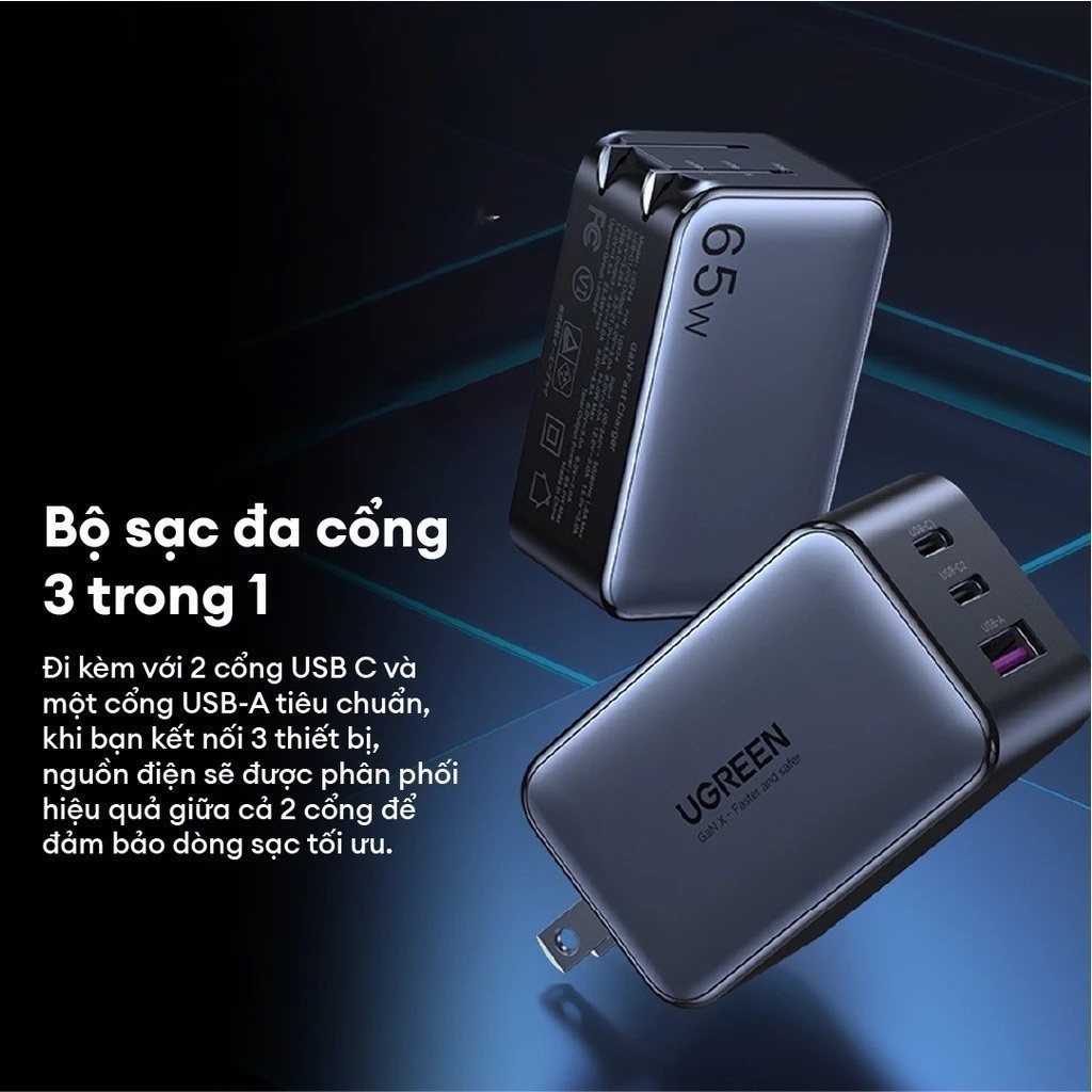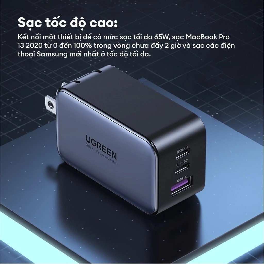Củ sạc nhanh GaN 65W (1 USB-A và 2 USB-C) công nghệ GaN màu đen chính hãng Ugreen 10334/10335 Cao Cấp