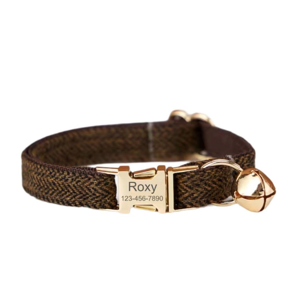 Vòng cổ mèo bằng vải Tweed, Bộ dây buộc cổ áo, Khóa vàng mở bên, Thẻ tên khắc tùy chỉnh, Cổ mèo con, Quà tặng mèo nhỏ, Chuông miễn phí