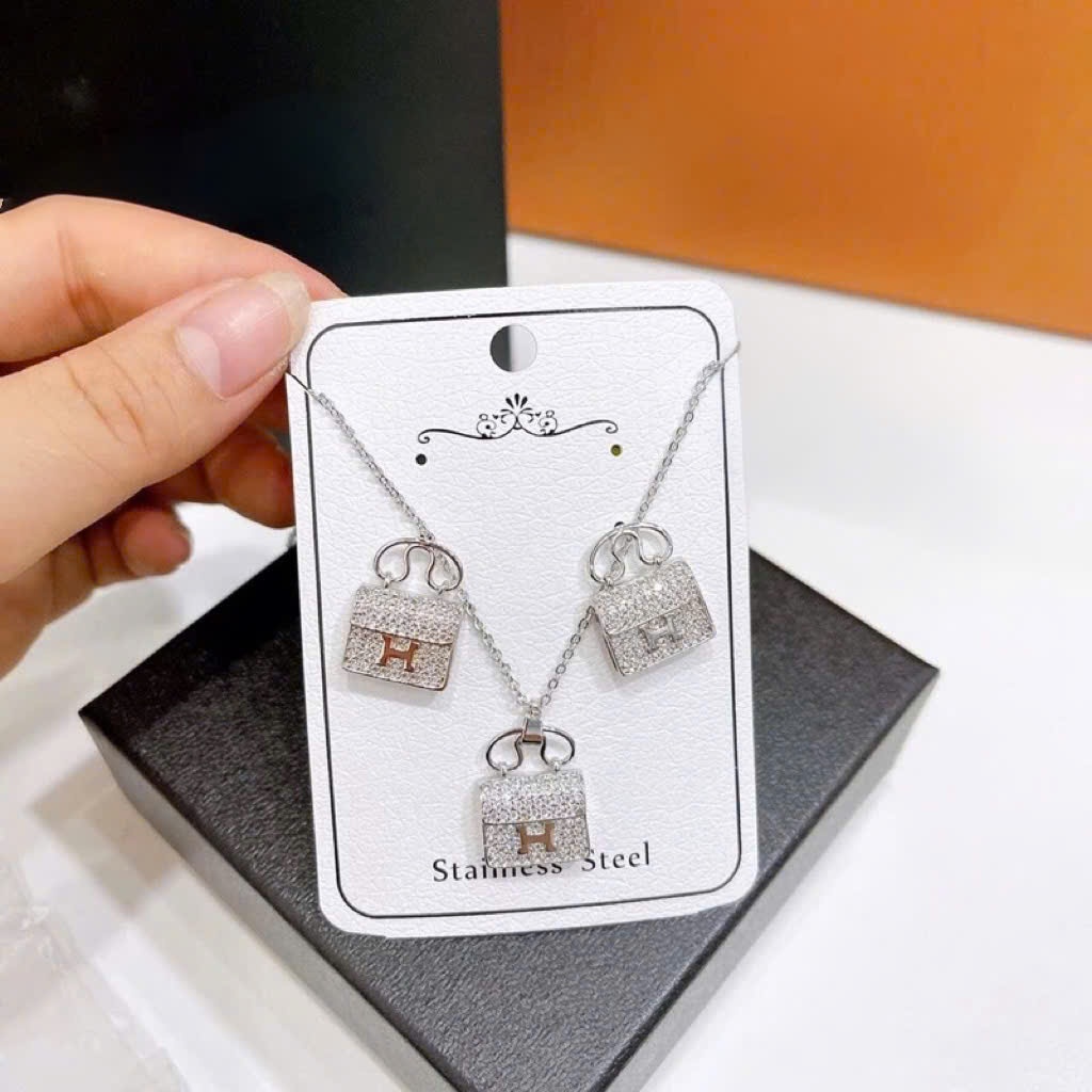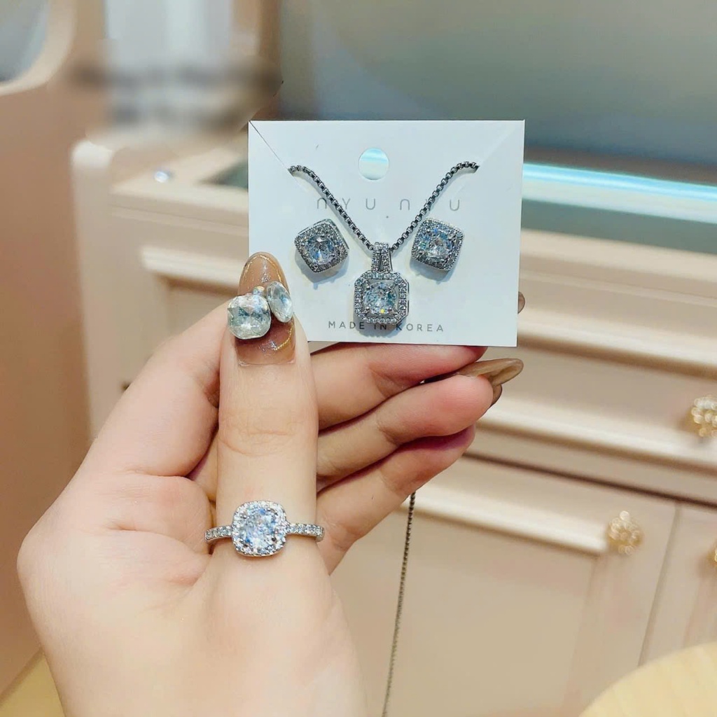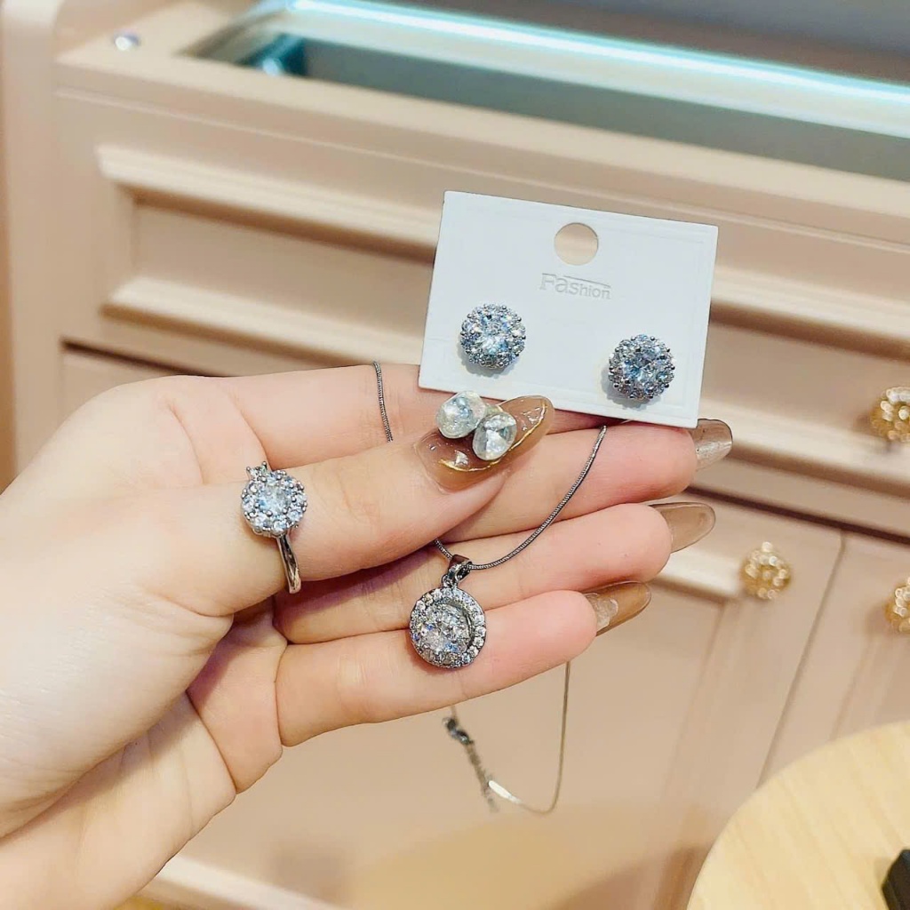 Bộ trang sức titan 3 món cao cấp sang trọng: vòng cổ, khuyên tai và nhẫn đính đá lấp lánh.