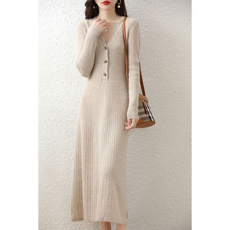 Đầm dài qua đầu gối cổ V dáng A đầm dệt kim cho phụ nữ mùa thu đông đầm dài len đa năng ôm sát thời trang