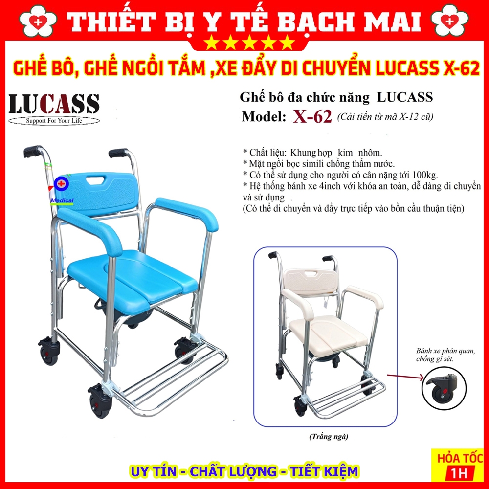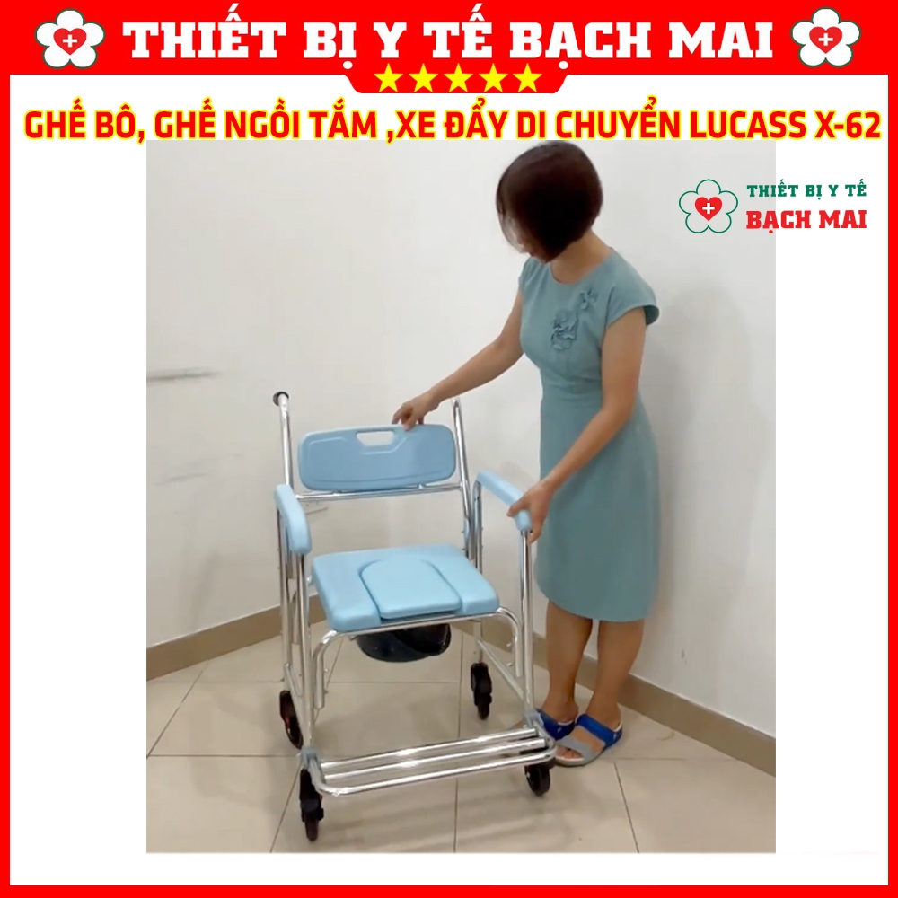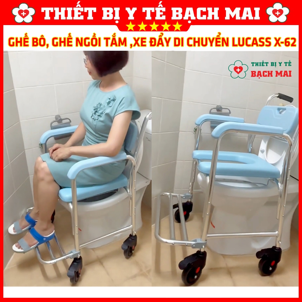 Ghế Bô Vệ Sinh Đa Năng LUCASS X-62, Xe Đẩy Di Chuyển, Ghế Ngồi Tắm - Khung Hợp Kim Nhôm