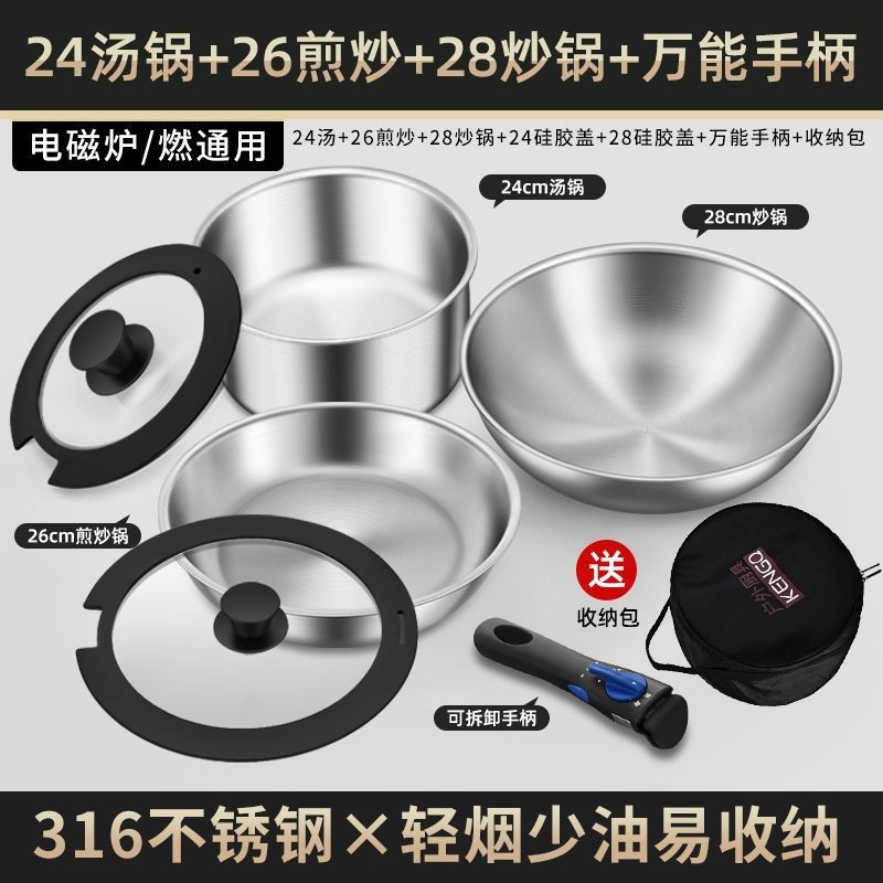 316Chảo rán bằng thép không gỉ, tay cầm có thể tháo rời, chảo không tráng, bộ ba món, bộ dụng cụ nấu ăn nhà bếp