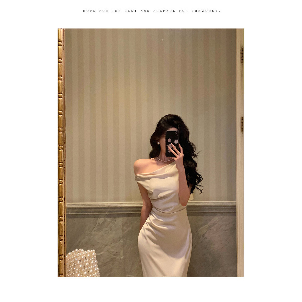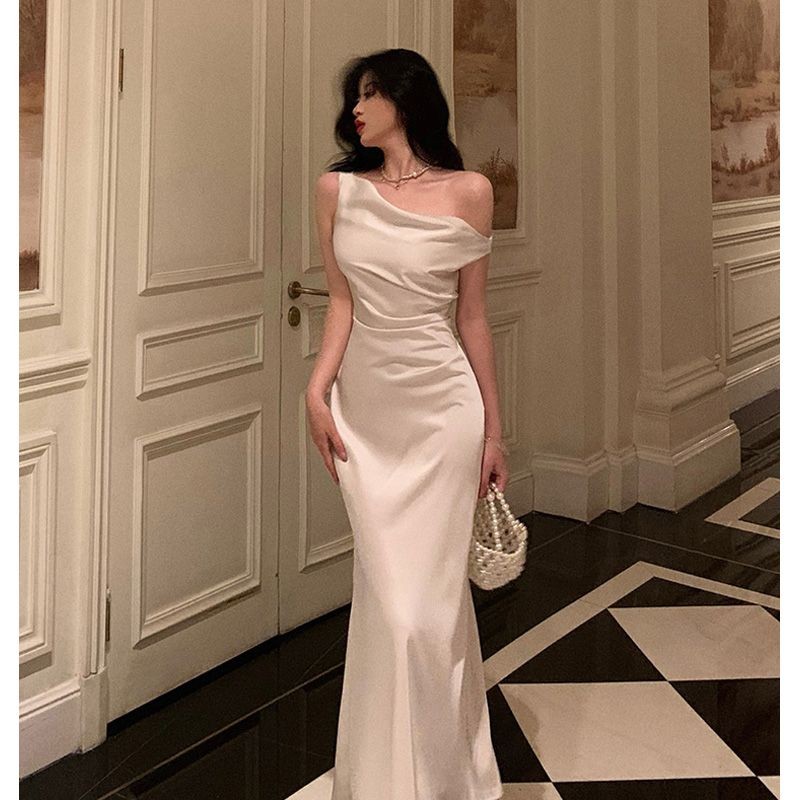 Đầm satin cao cấp kiểu Pháp cho phụ nữ, thiết kế mới, thanh lịch, ôm eo, đầm đuôi cá dài