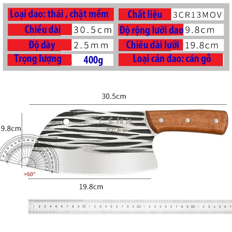 dao làm bếp, dao thái chặt mềm bằng thép không rỉ, dao thái thịt, dao chặt gà, dao to, dao thép không rỉ D23