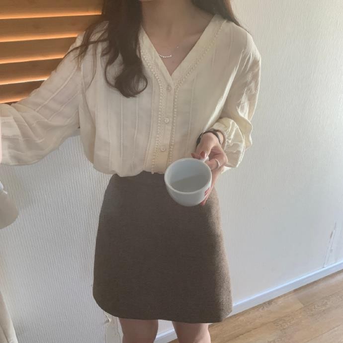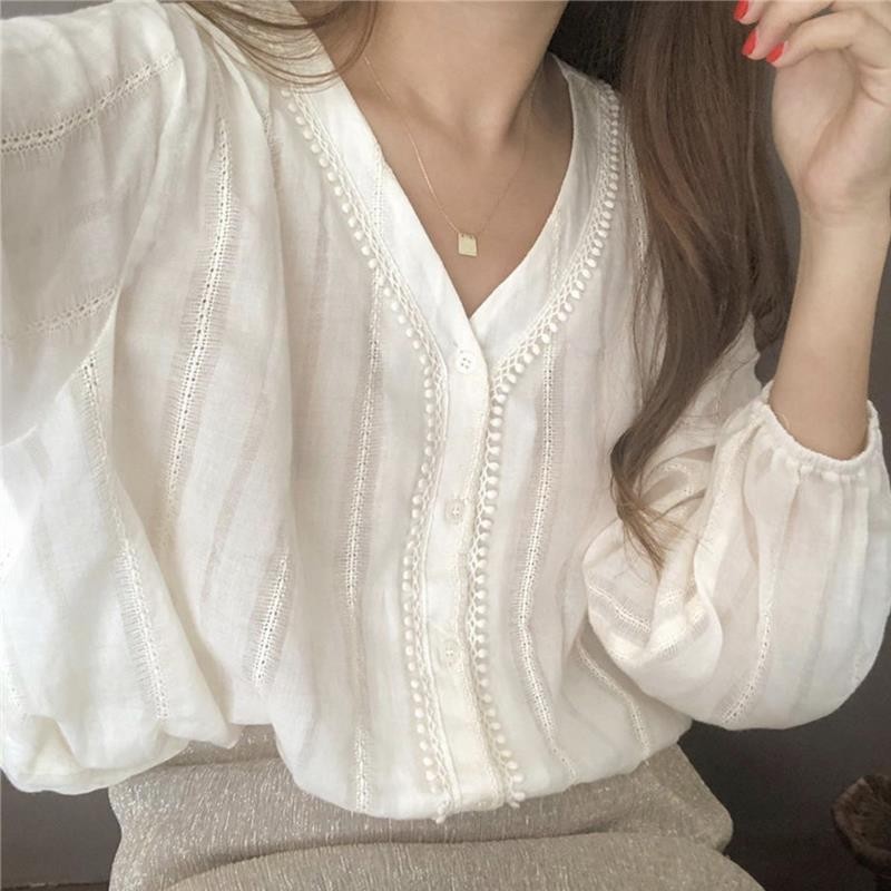 Áo blouse ren tay phồng cổ V cho phụ nữ, phong cách Hàn Quốc, áo sơ mi trắng tay dài