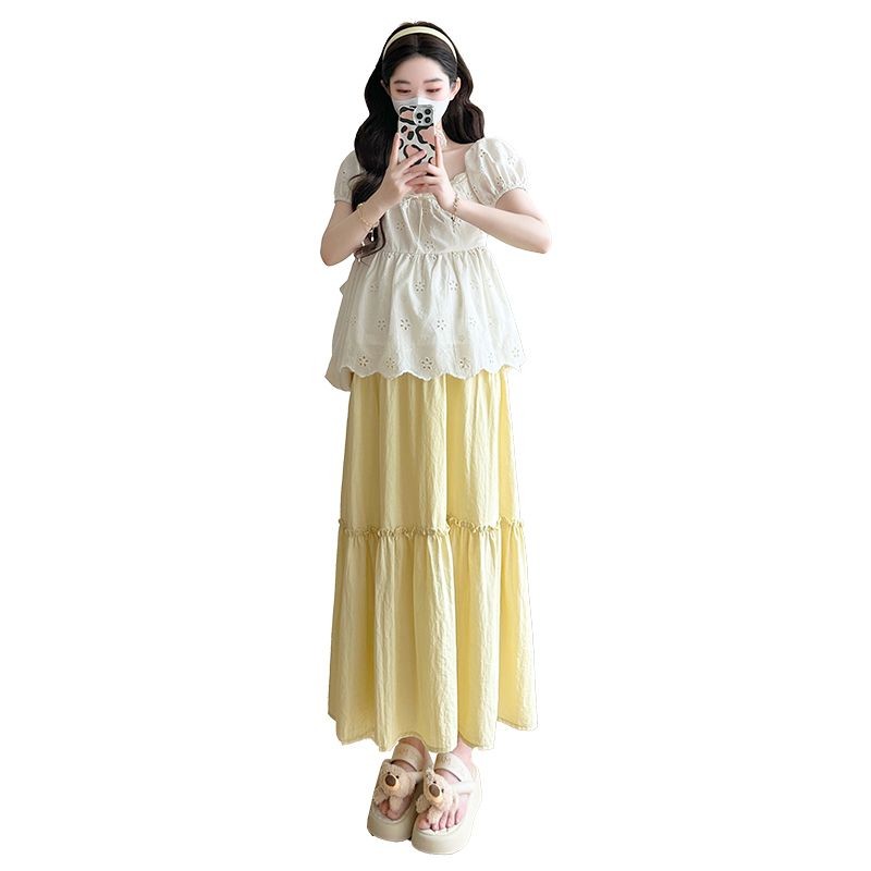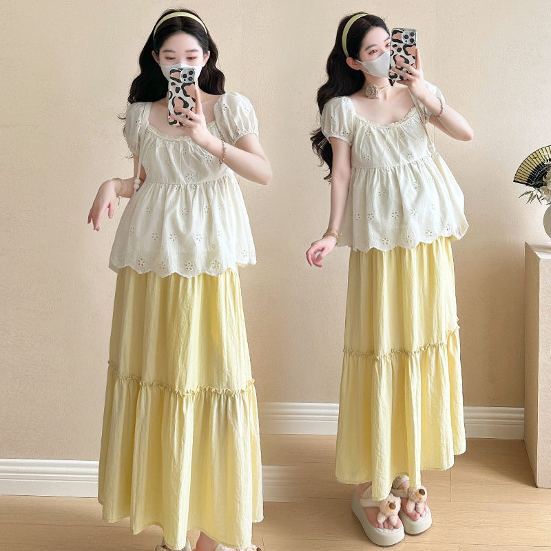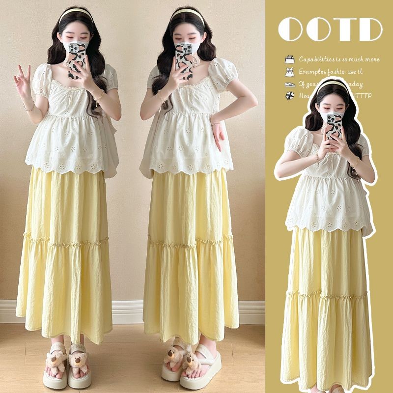 Áo bà bầu cỡ lớn của người nổi tiếng trên internet, mùa hè mới, áo babydoll thêu ngọt ngào tươi mát + váy bà bầu