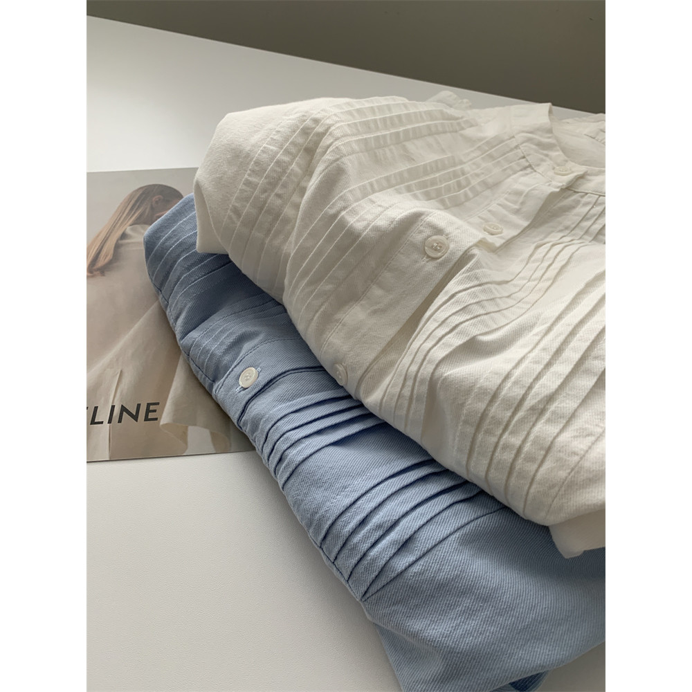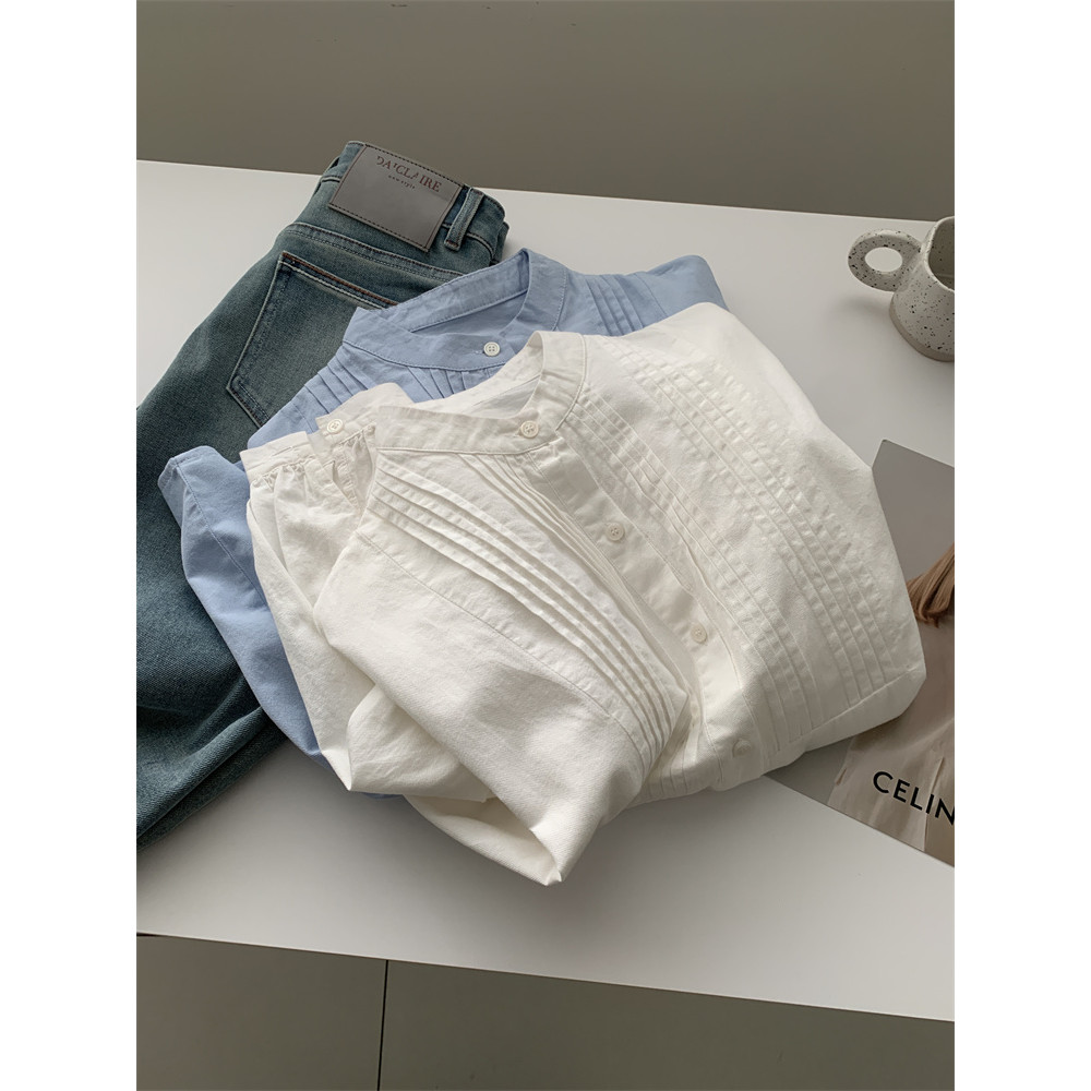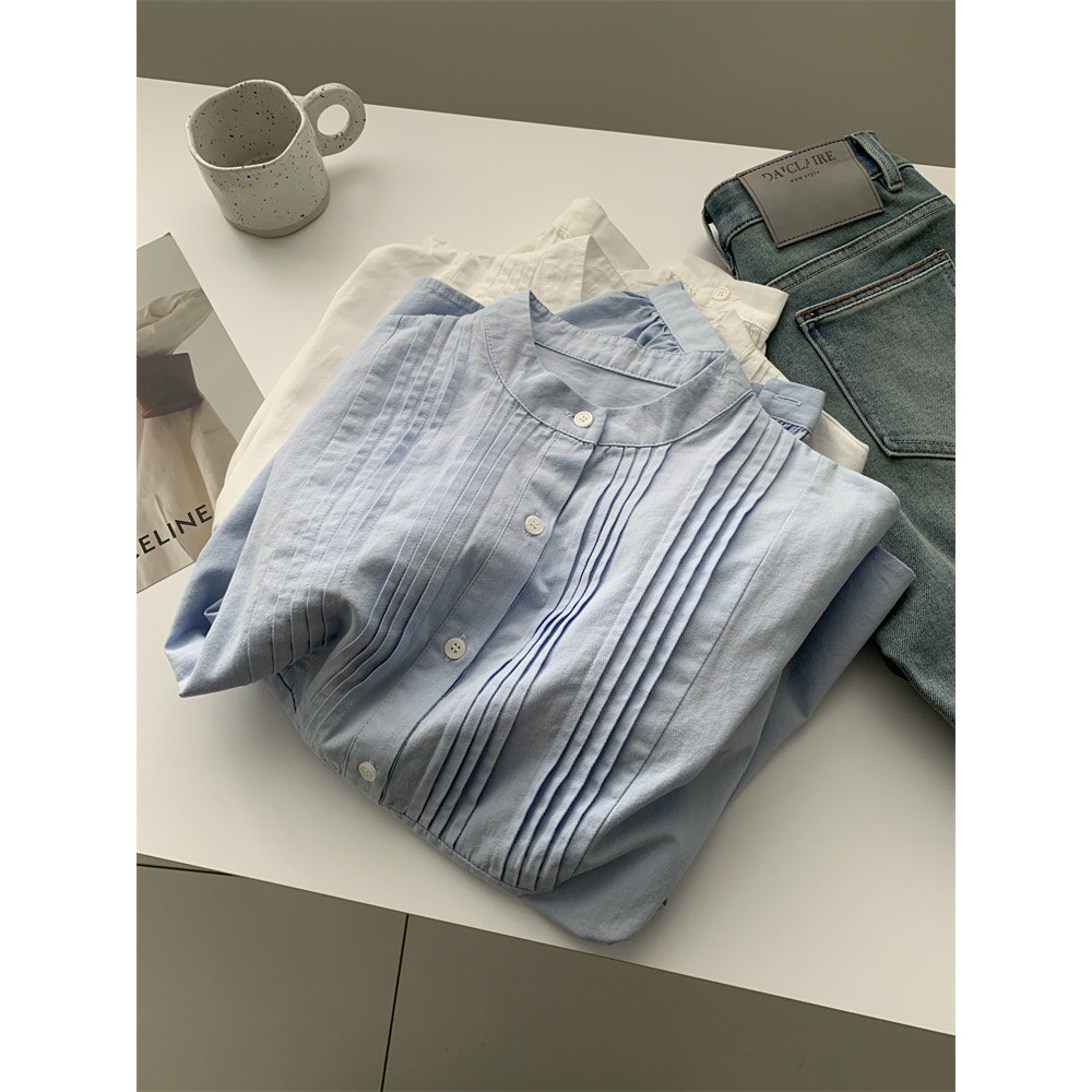 Áo sơ mi cổ tròn xếp ly kiểu Pháp cho phụ nữ, áo dài tay giảm tuổi nhẹ nhàng, mùa xuân và thu