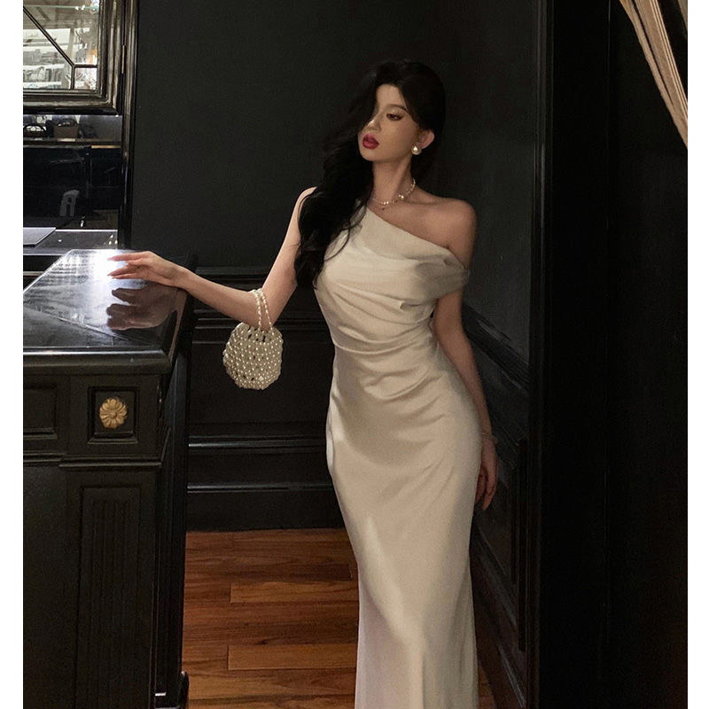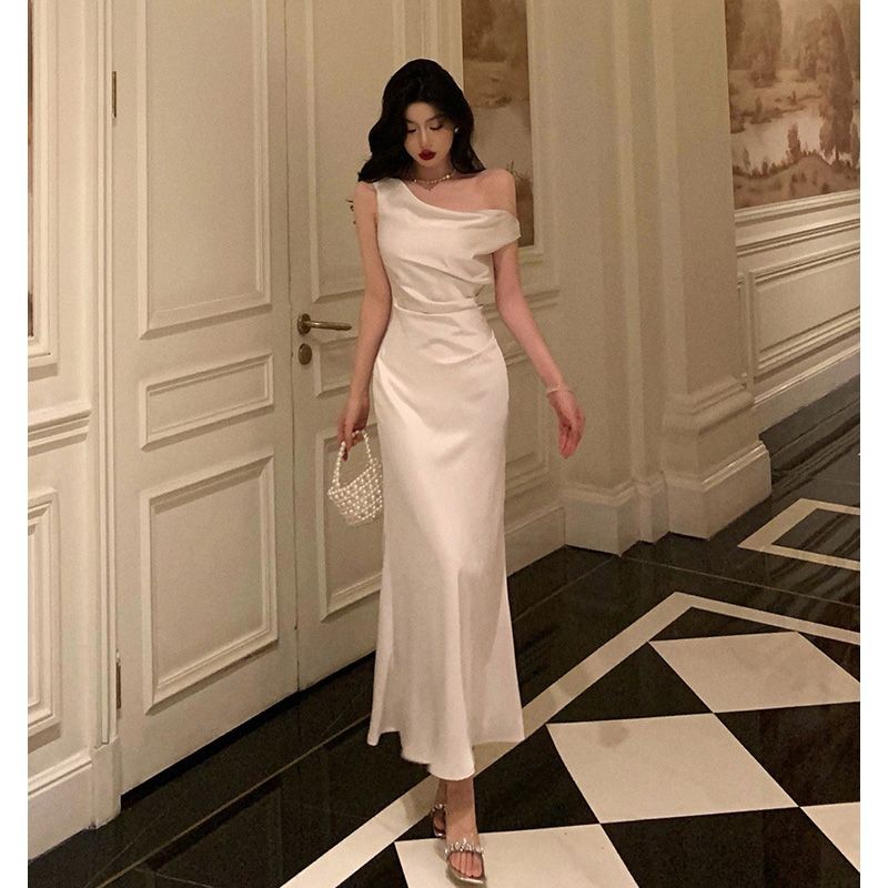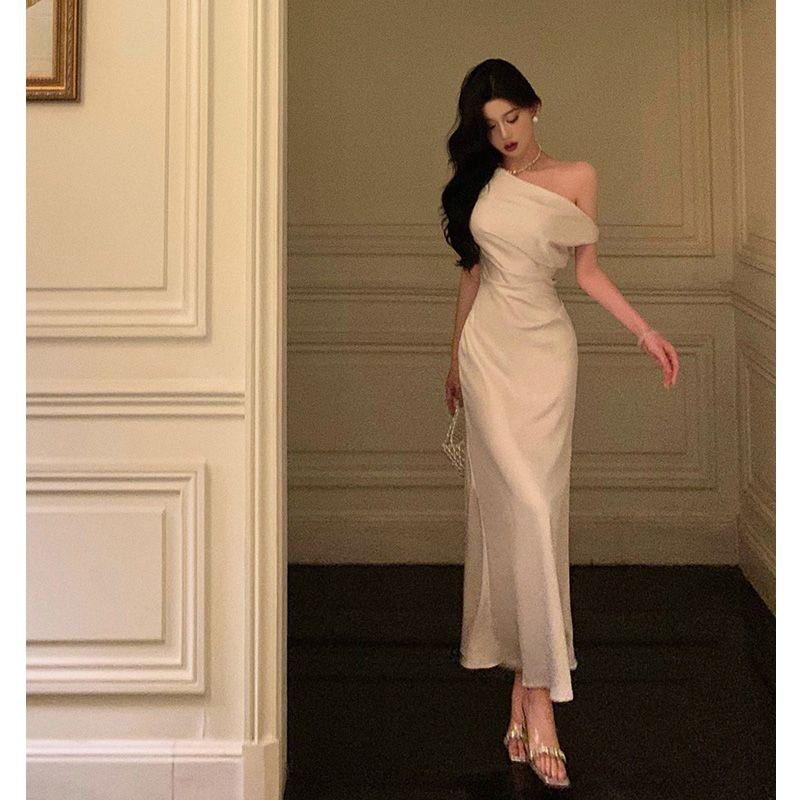 Đầm Lụa Dài Cao Cấp Kiểu Pháp, Thiết Kế Đuôi Cá Ôm Sát Vai Xiên Thanh Lịch Khí Chất