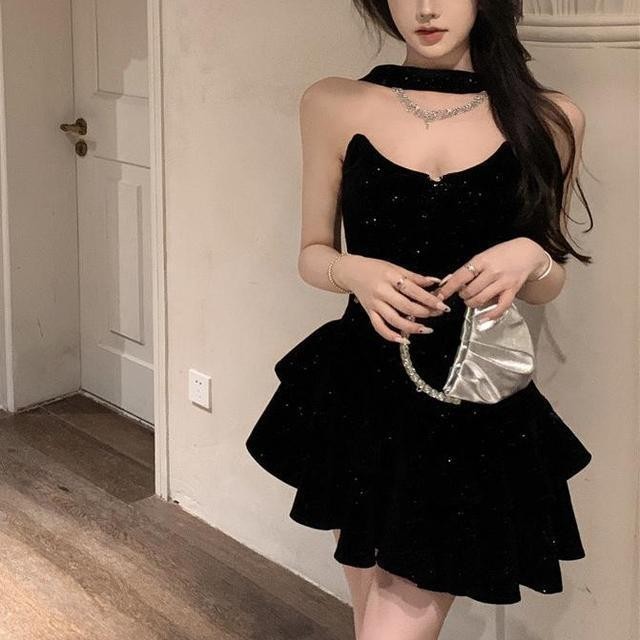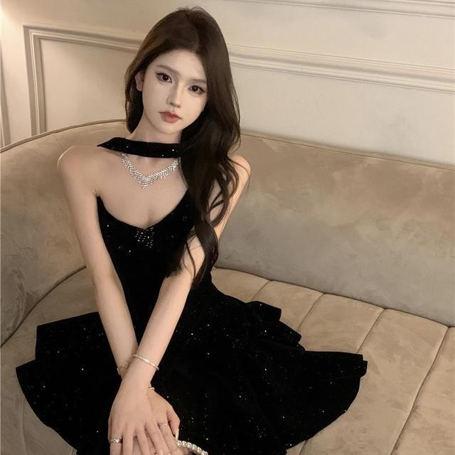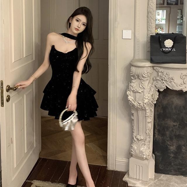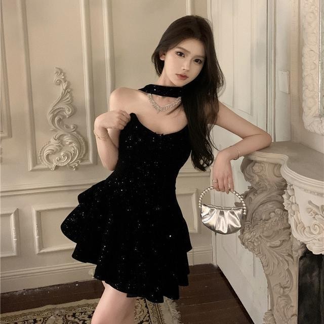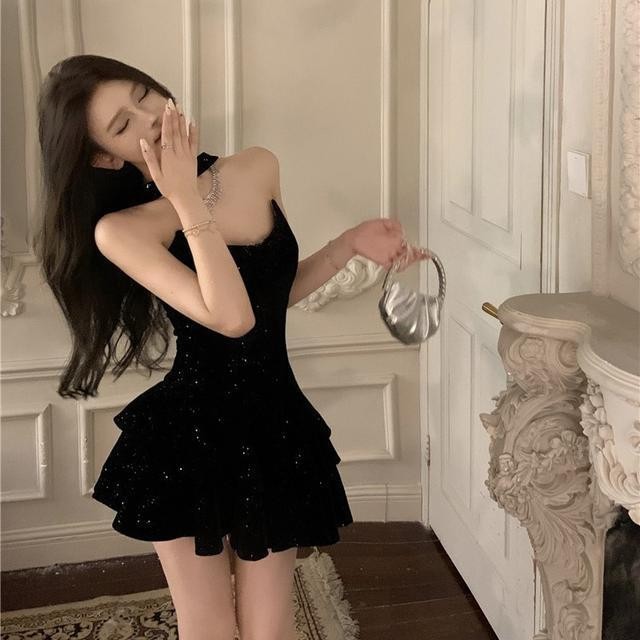 Váy sinh nhật đen thanh lịch cho các quý cô, váy ngắn phồng lấp lánh tinh tế, váy tiệc nhung không tay sexy