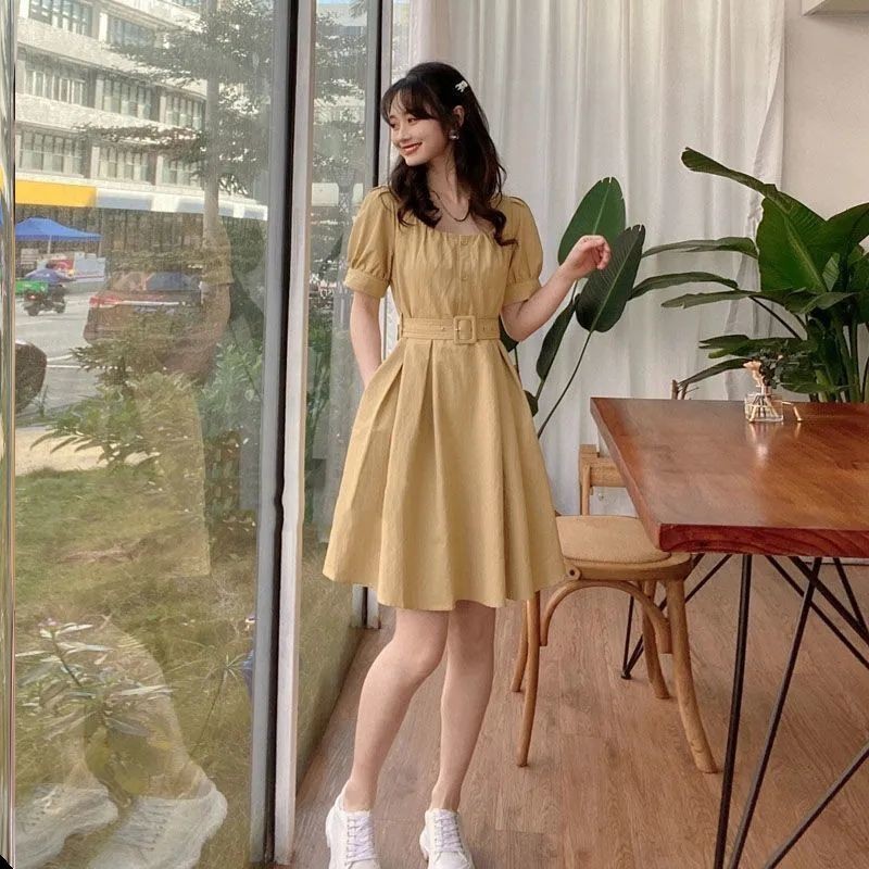 Váy Liền Cao Cấp Mùa Hè Cổ Vuông Váy Ngắn Tay Dáng Nhỏ Tôn Dáng Thắt Eo Kiểu Pháp Ngọt Ngào Mẫu Mới