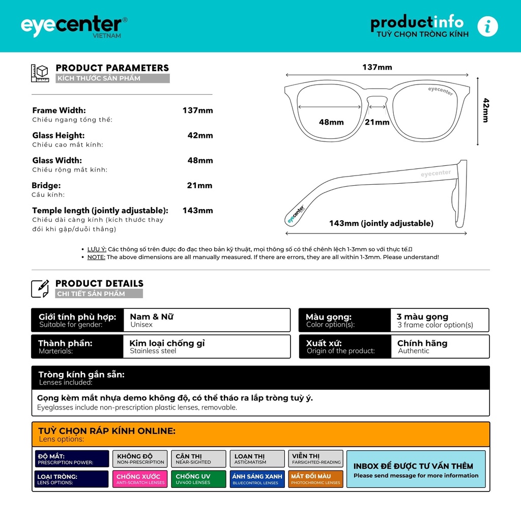Gọng kính cận nam nữ KENDRICK chính hãng ZAC & CODY A10-S kim loại chống gỉ cao cấp nhập khẩu by Eye Center Vietnam