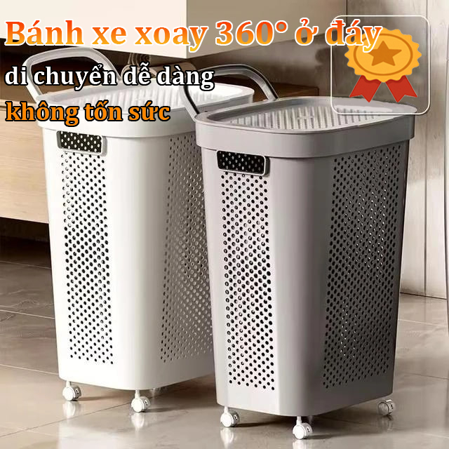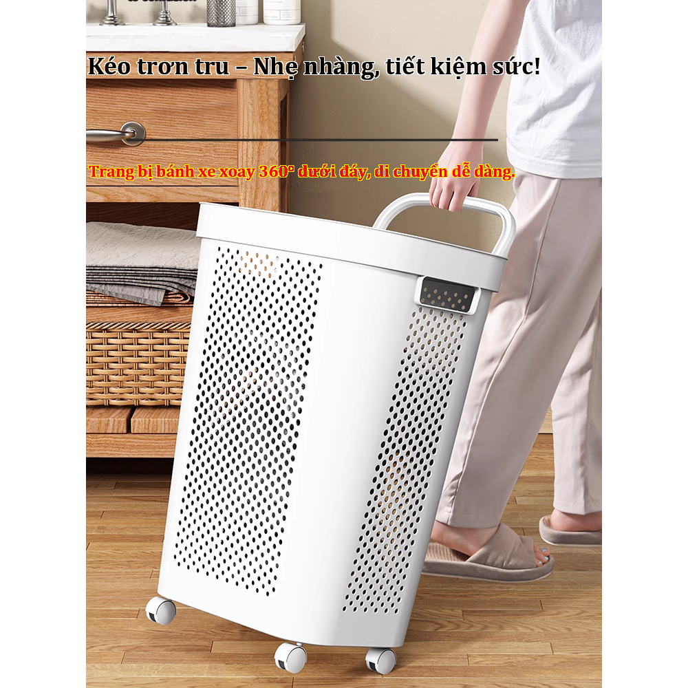 Giỏ đựng quần áo 60L có nắp, kèm bánh xe, thiết kế lỗ thoáng khí tiện lợi