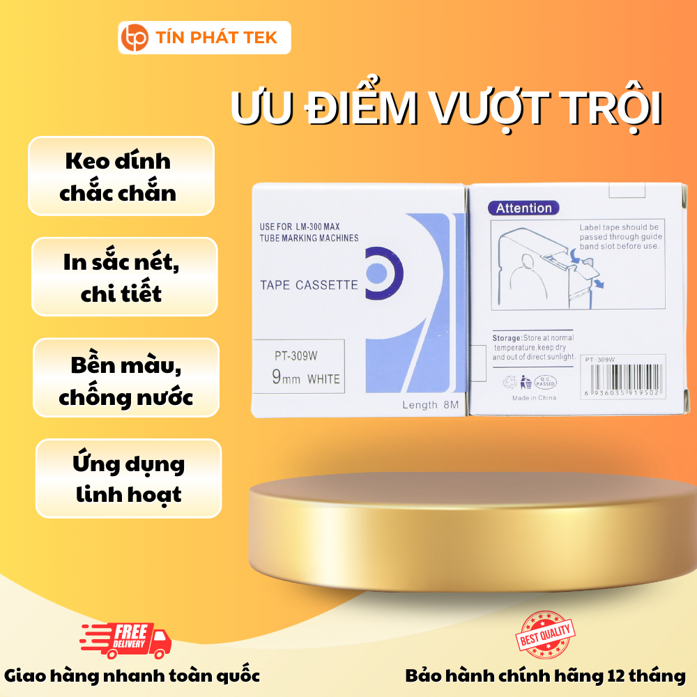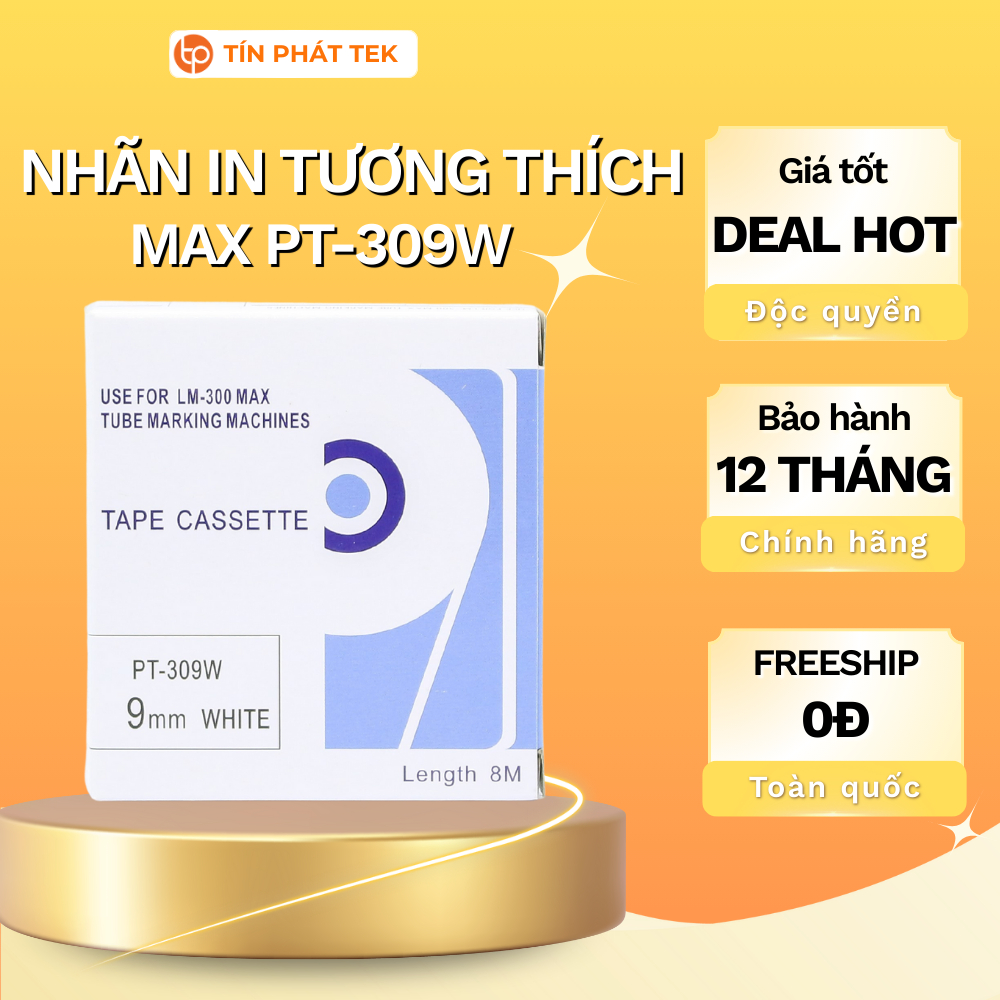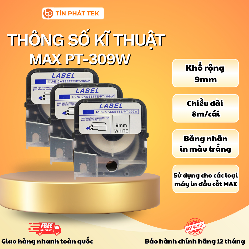 Băng in nhãn Max PT-309W, rộng 9mm, dài 8m/cuộn, màu trắng, dùng cho máy in ống lồng đầu cốt MAX