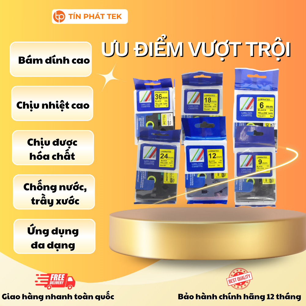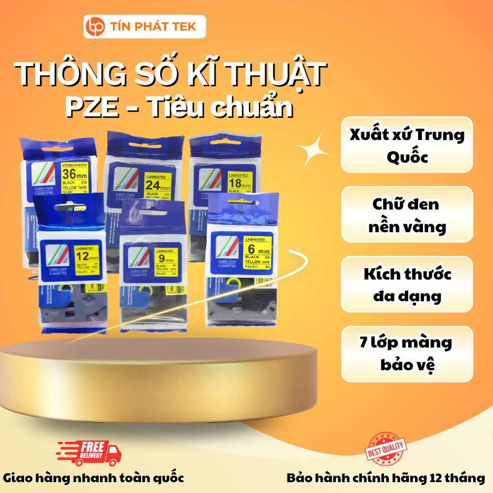 Nhãn in PZE- Tiêu chuẩn, Chữ đen nền vàng(Black on Yellow), Khổ rộng từ 6mm - 36mm. Nhãn đa lớp, bám dính cao.