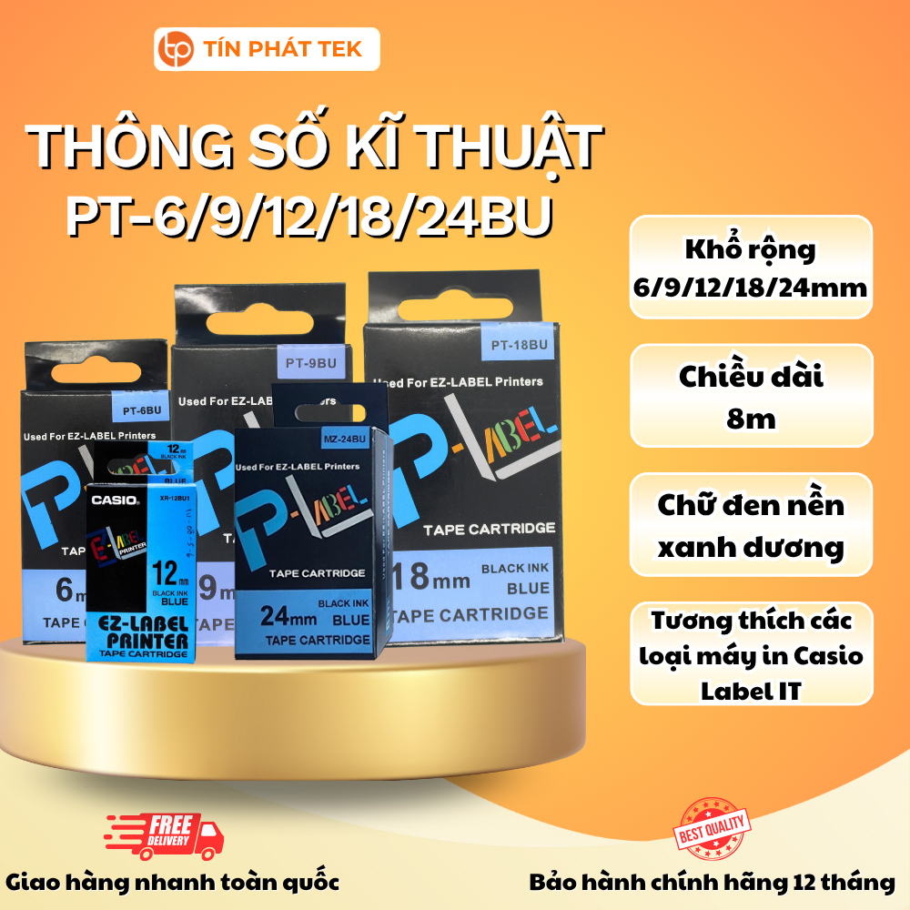 Nhãn in Casio 6/9/12/18/24mm x 8m, màu trắng/vàng/đỏ/xanh dương, dùng cho máy in Casio Label IT