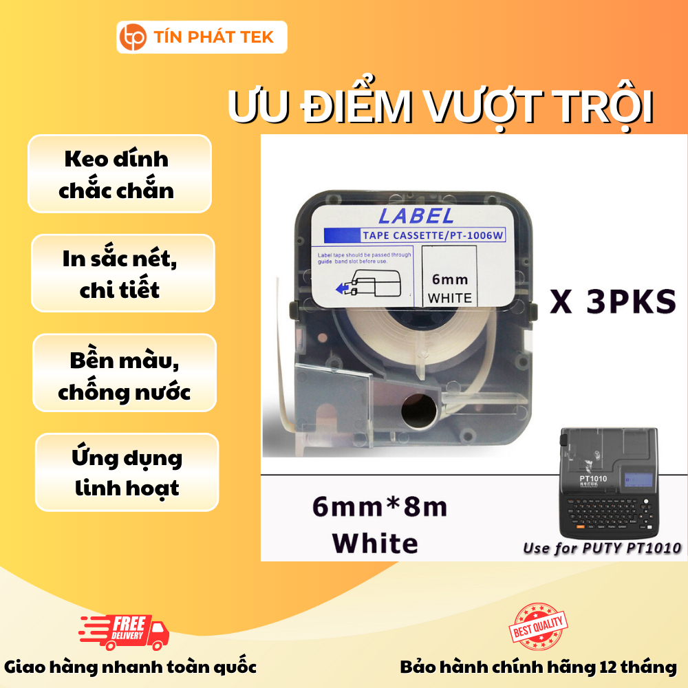 Băng nhãn in PUTY PT-1006W, rộng 6mm, dài 8m/cuộn, sử dụng cho máy in ống lồng PUTY 1010