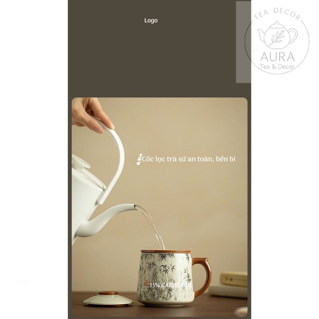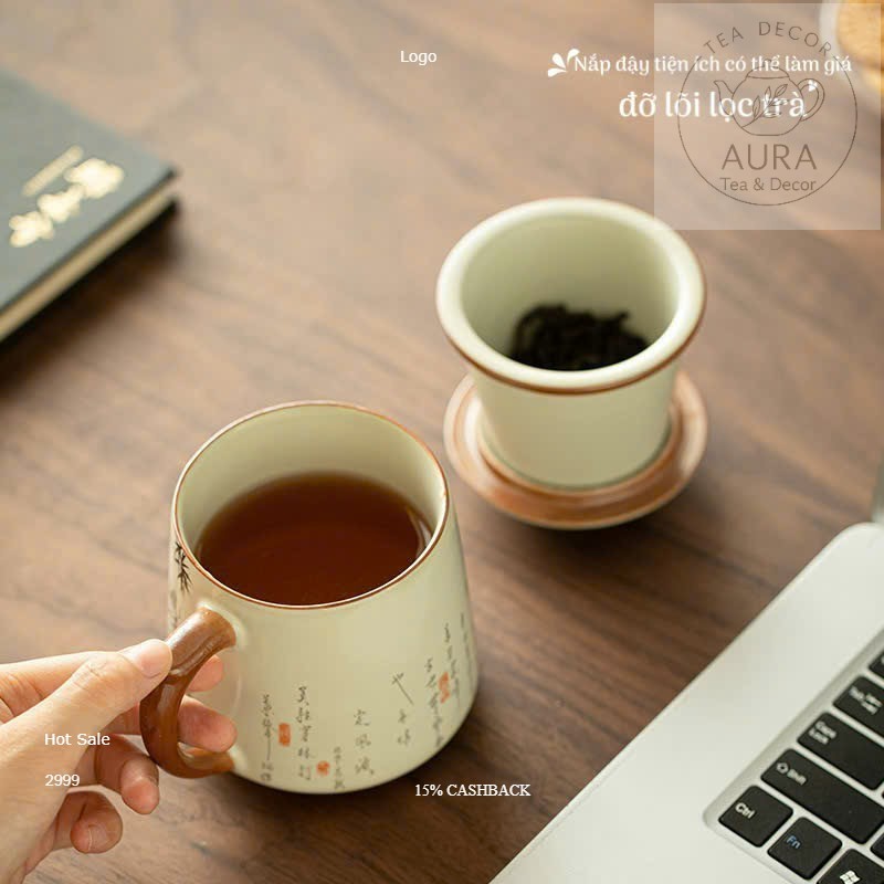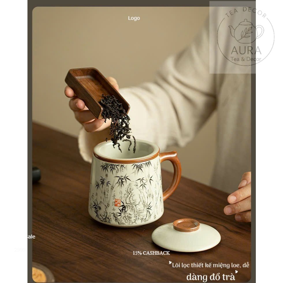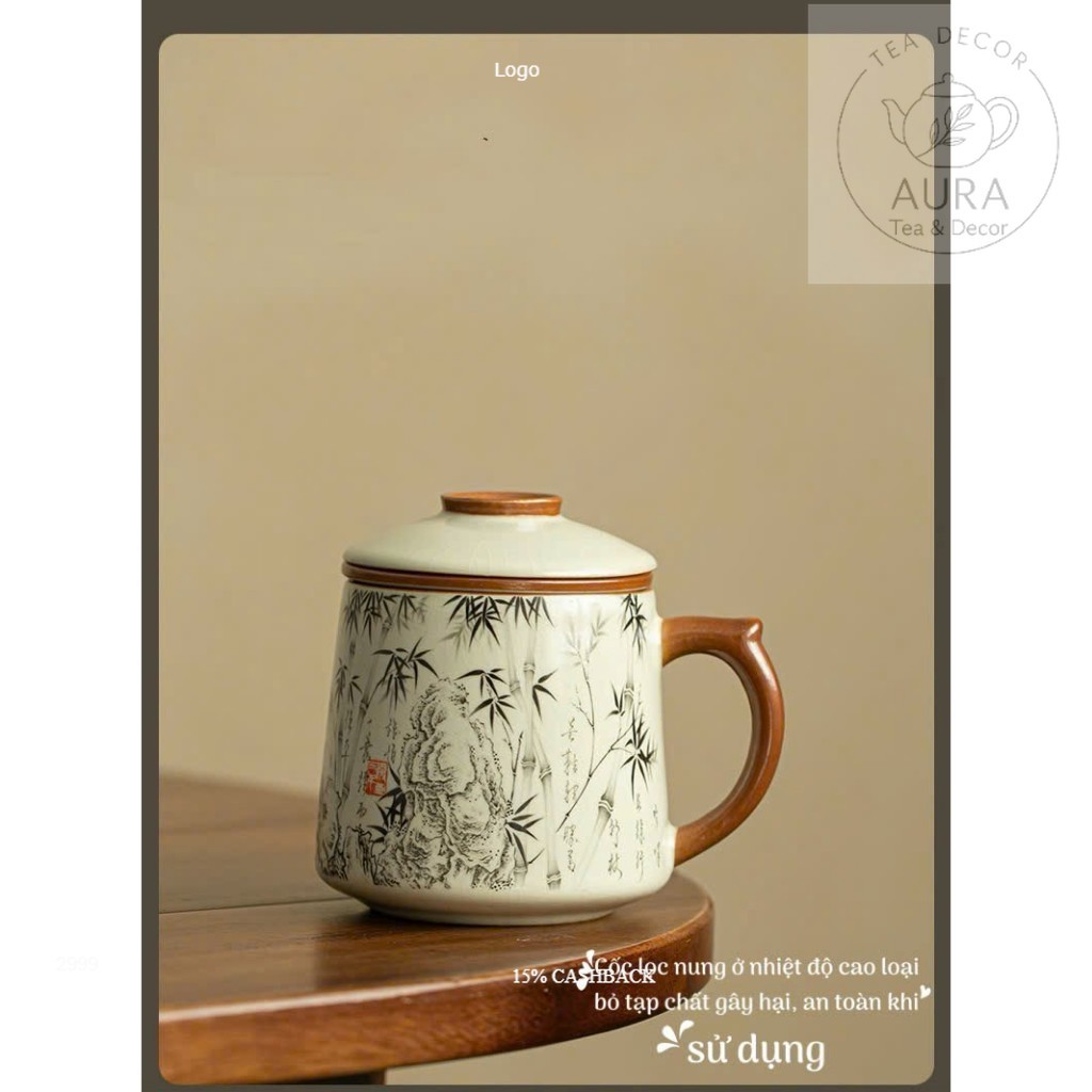 Cốc lọc trà sứ có nắp & lõi lọc – ly uống trà văn phòng họa tiết trúc mực 400ml