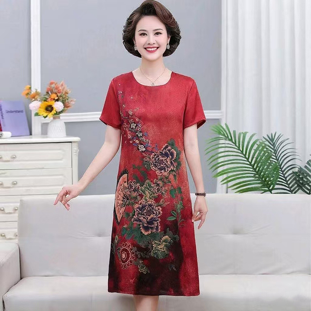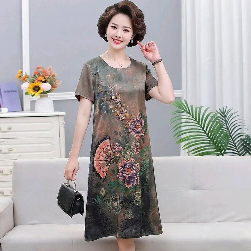 Đầm mùa hè tay ngắn bằng lụa lạnh cho mẹ trung niên, mẫu mới, trang phục in họa tiết giả