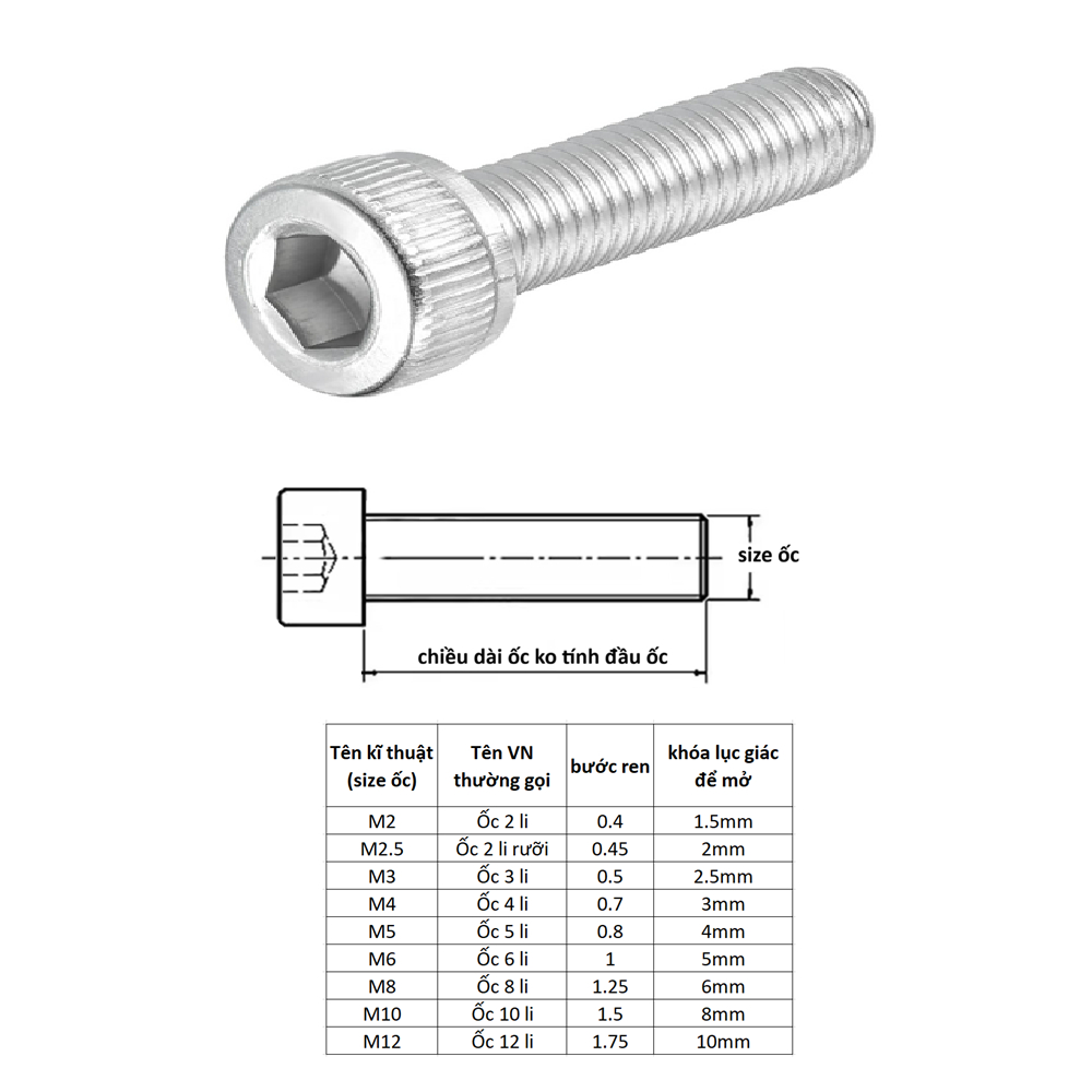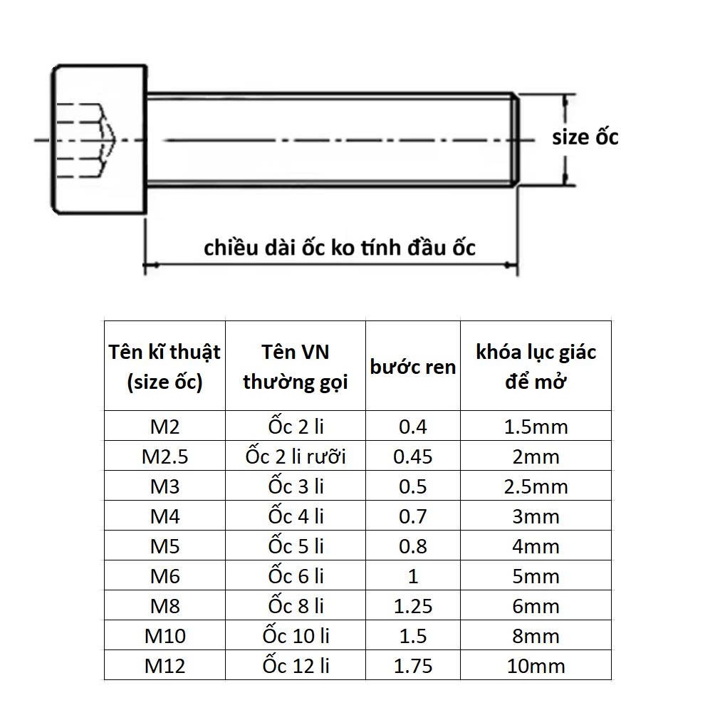 Ốc lục giác đầu trụ INOX 2.5 li (M2.5) 2.5x3 2.5x4 2.5x5 2.5x6 2.5x8 2.5x10 2.5x12 2.5x16 2.5x20