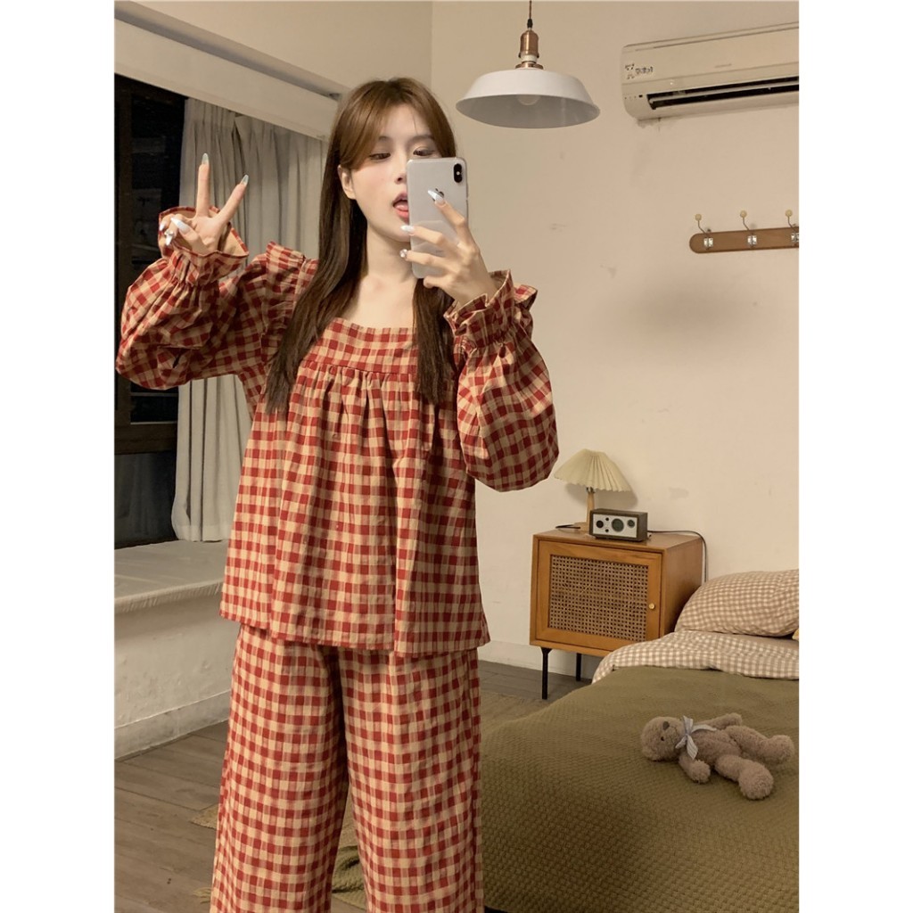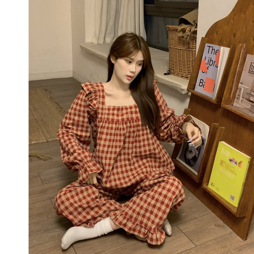 Bộ ngủ dài tay LUGIAN, bộ kẻ caro đỏ phối cổ vuông bigsize dễ thương tiểu thư phong cách loli 6279 M-1