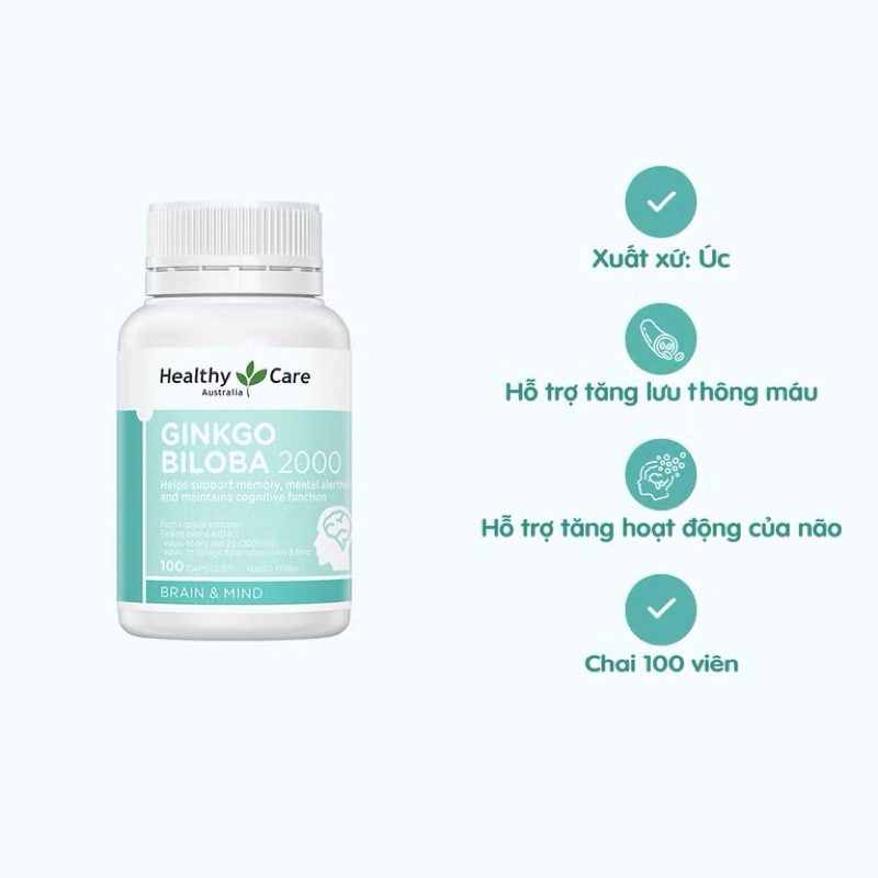 Viên uống Healthy Care Ginkgo Biloba 2000mg hỗ trợ tuần hoàn máu não (Chai 100 viên)
