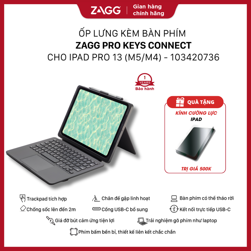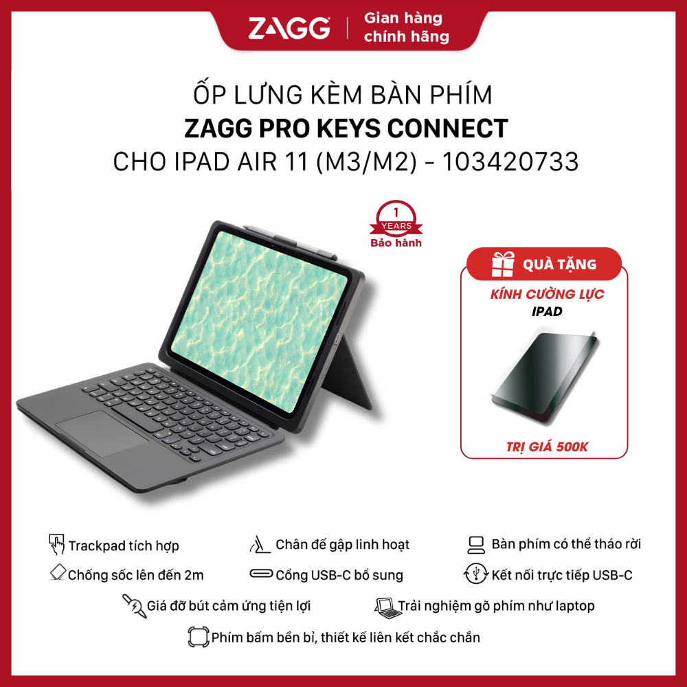Ốp lưng kèm bàn phím ZAGG Pro Keys chống sốc dành cho iPad Air 6 M2 2024/Pro M4 2024/Pro/10.9/10.9gen10/11/12.9inch