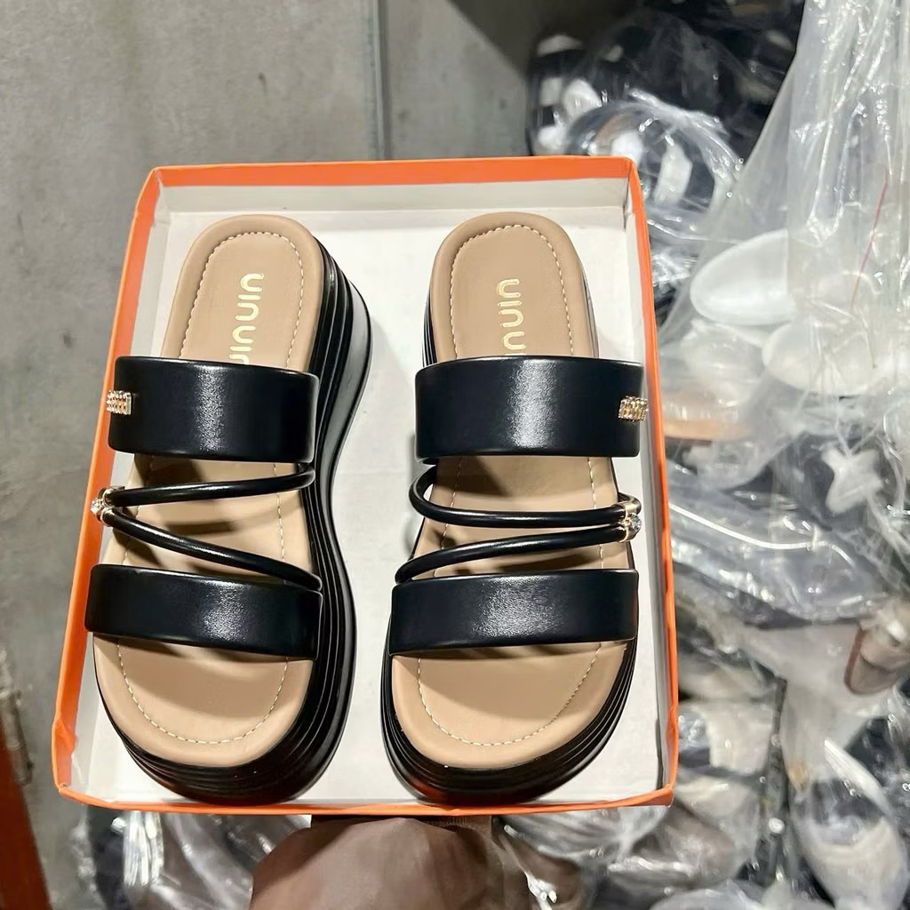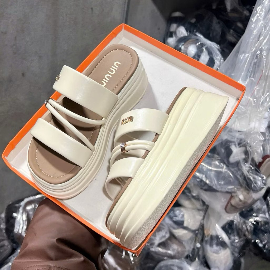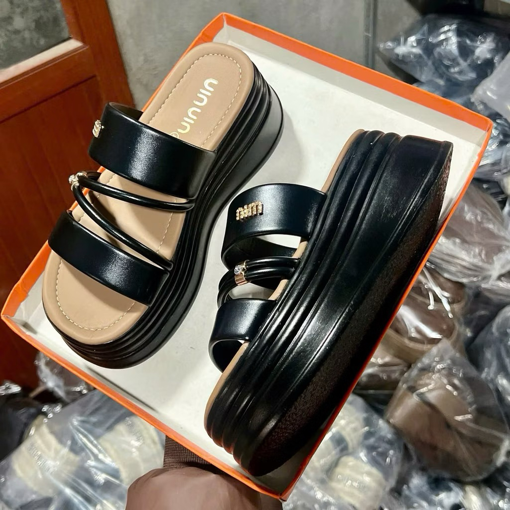 dép đế xuồng da dép nữ 4 quai đế cao 7cm đế nhẹ quai da mịn đế nâu