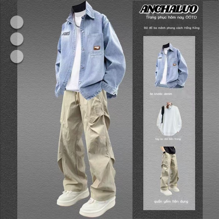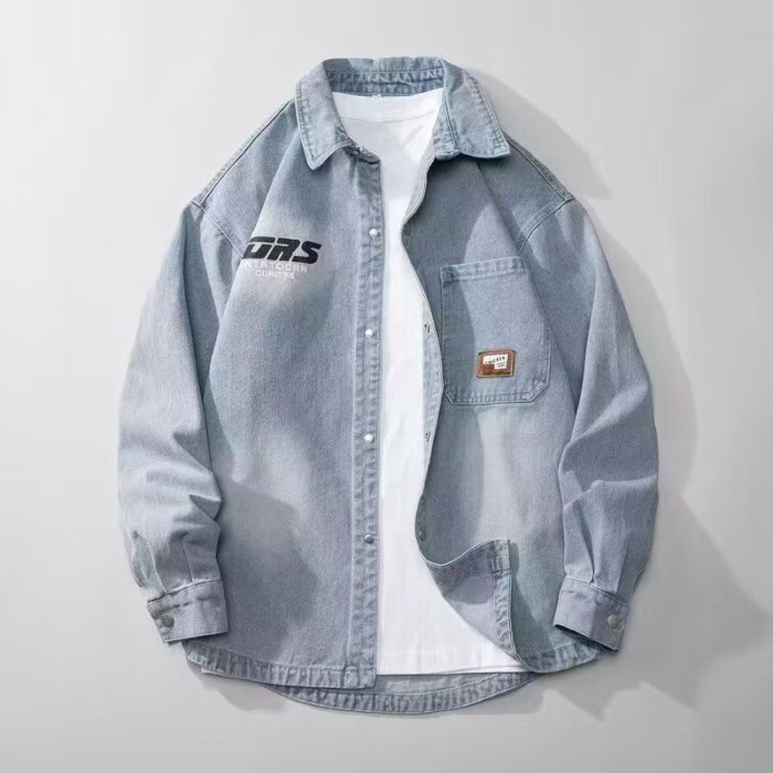 L Bộ đồ sơ mi denim dài tay phong cách Nhật Bản mùa thu Áo khoác nam dáng rộng phong cách Nhật Bản