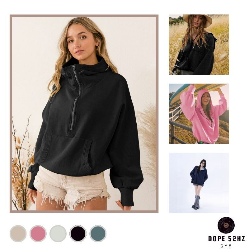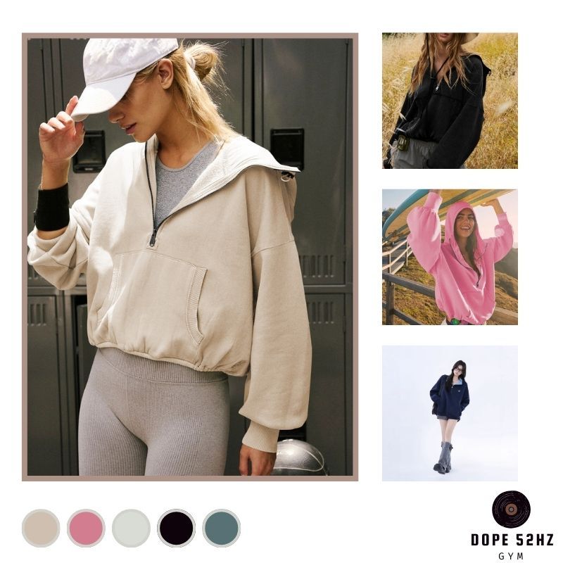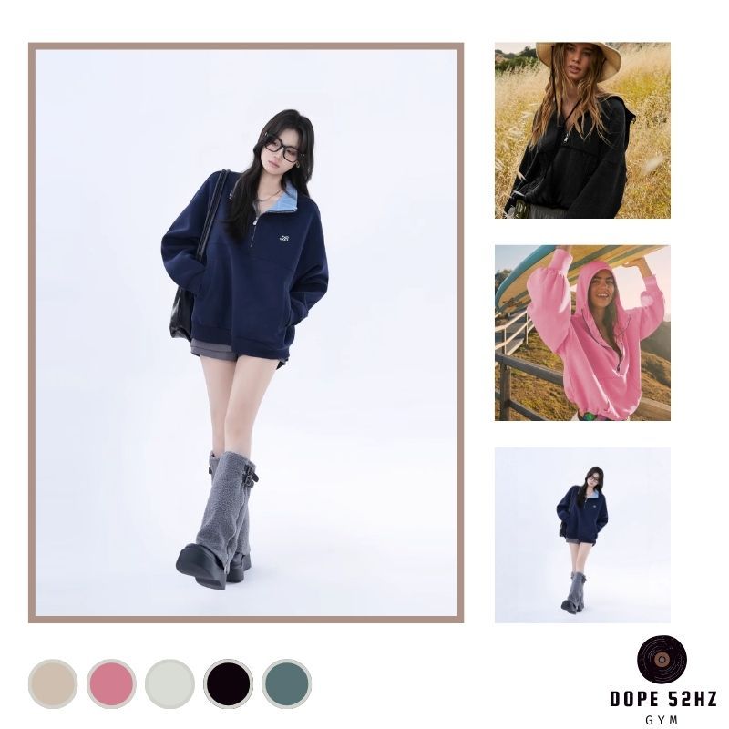 DOPE52HZ-Bộ đồ thể thao nữ dáng rộng – Áo khoá kéo cổ cao + quần ống suông màu be mặc thoải mái