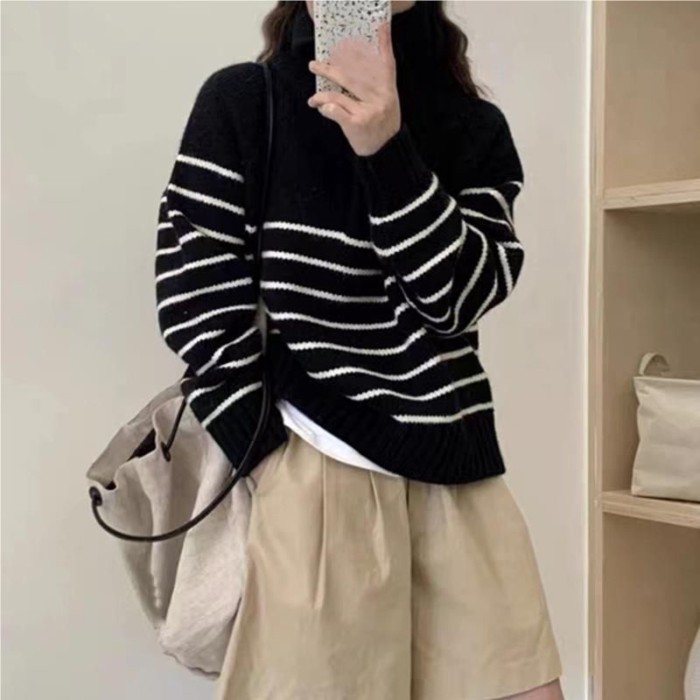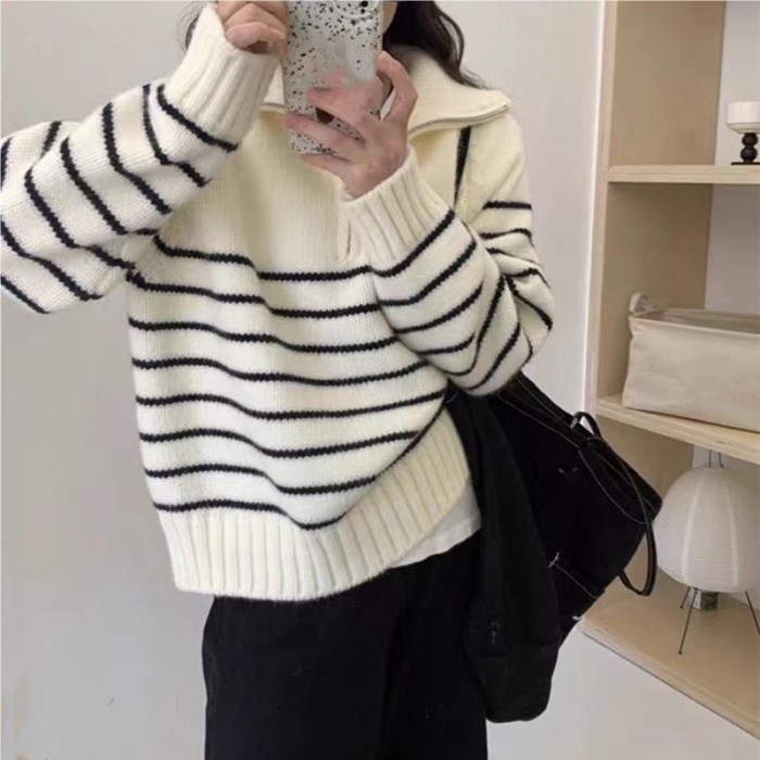 Áo len dệt kim dáng rộng có dây kéo sọc phong cách Hàn Quốc cho mùa thu và đầu thu áo dài tay