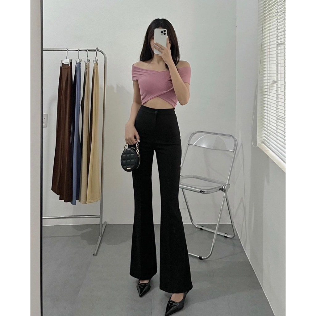 Quần Ống Loe Đen 1 Nút, Không Túi, Cạp Cao, Form Vòng 3 Cực Đẹp, Vải Co Dãn, Siêu Hack Dáng