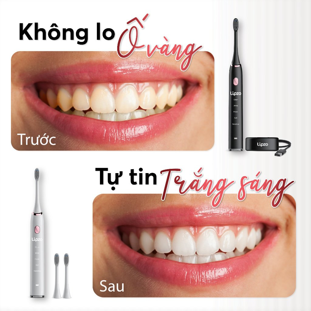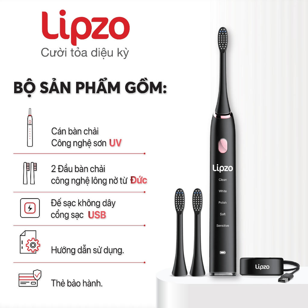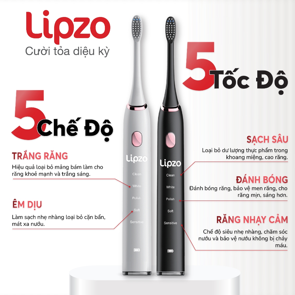 Bàn Chải Điện Lipzo Chính Hãng - 5 Chế Độ Làm Sạch Gấp 20 Lần, Sóng Âm 40.000 Nhịp, BH 24 Tháng