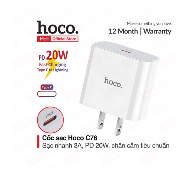 Cốc sạc nhanh PD20W Hoco C76 sạc nhanh 3.0A chân cắm dẹt 1 cổng Type-C