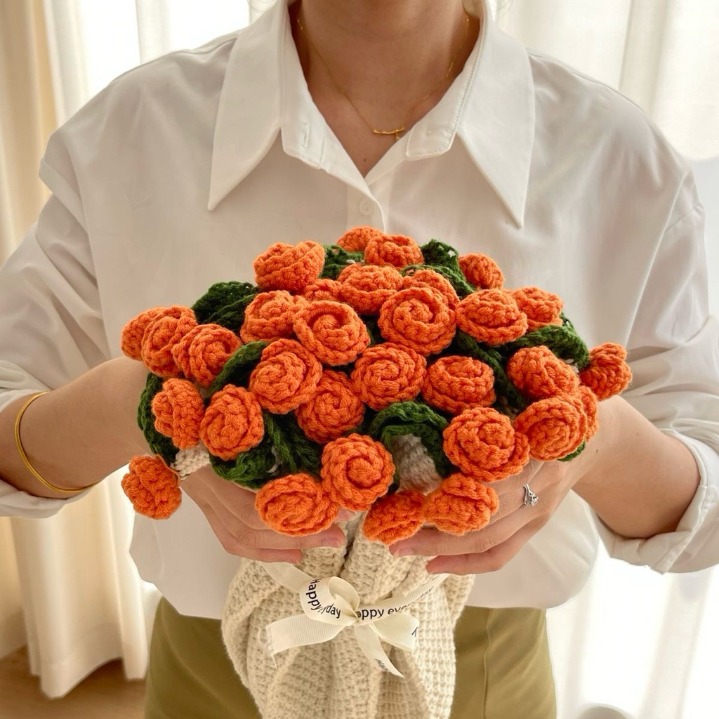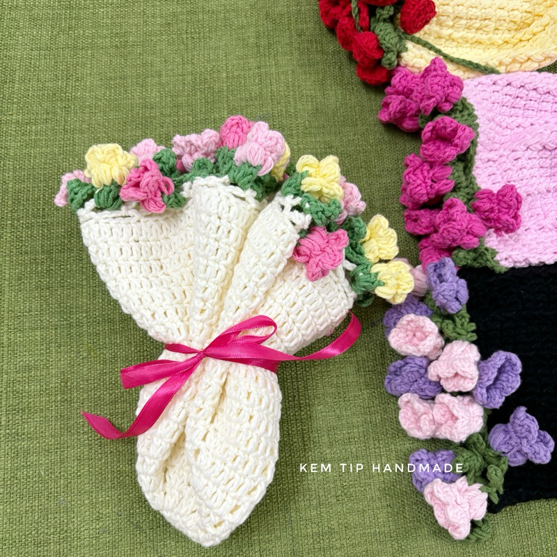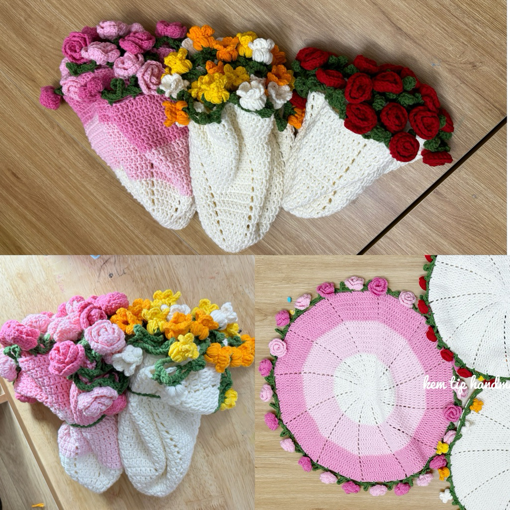 Khăn len, chăn hoa len, bó hoa len hoa hồng, linh lan nhiều màu móc tay