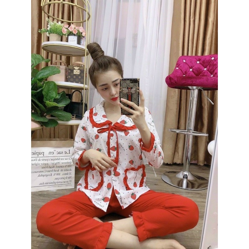 Bộ Pijama Lụa Hàn Dâu Dài Tay
