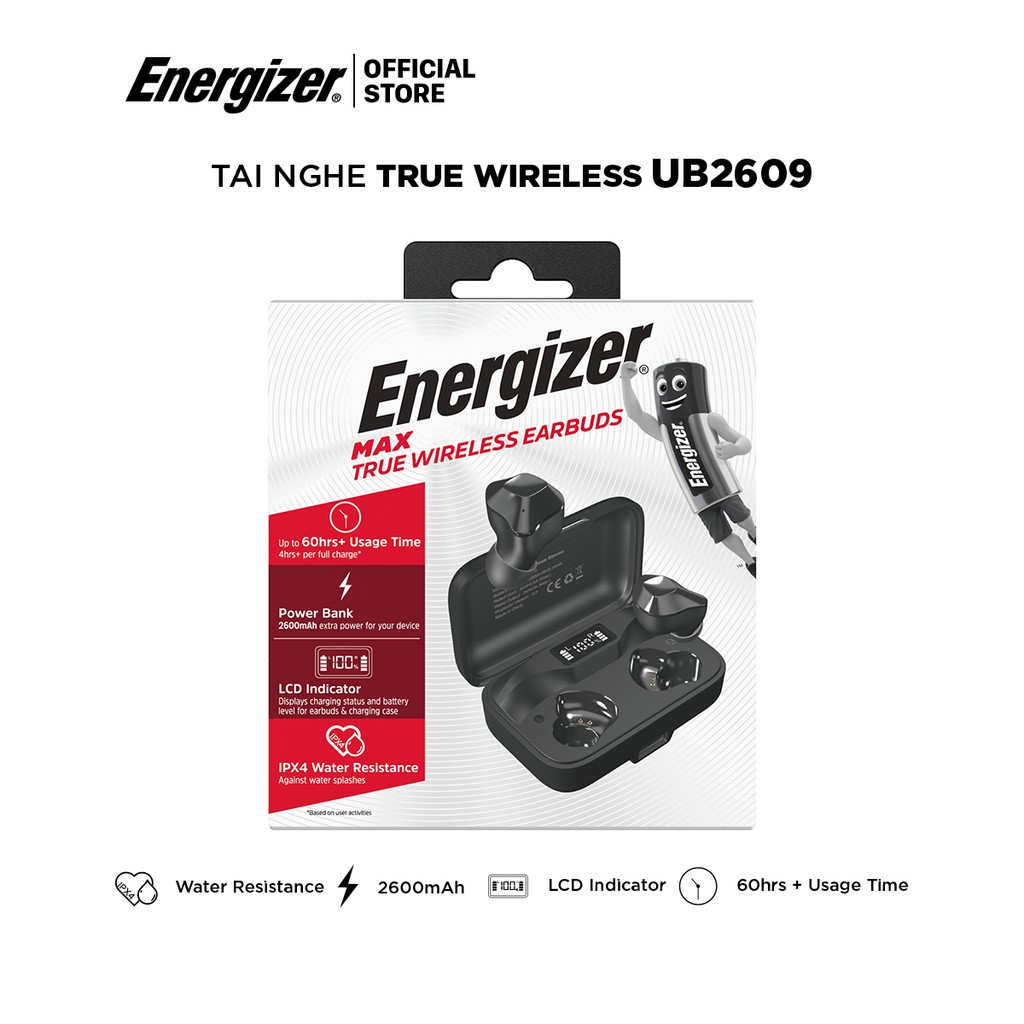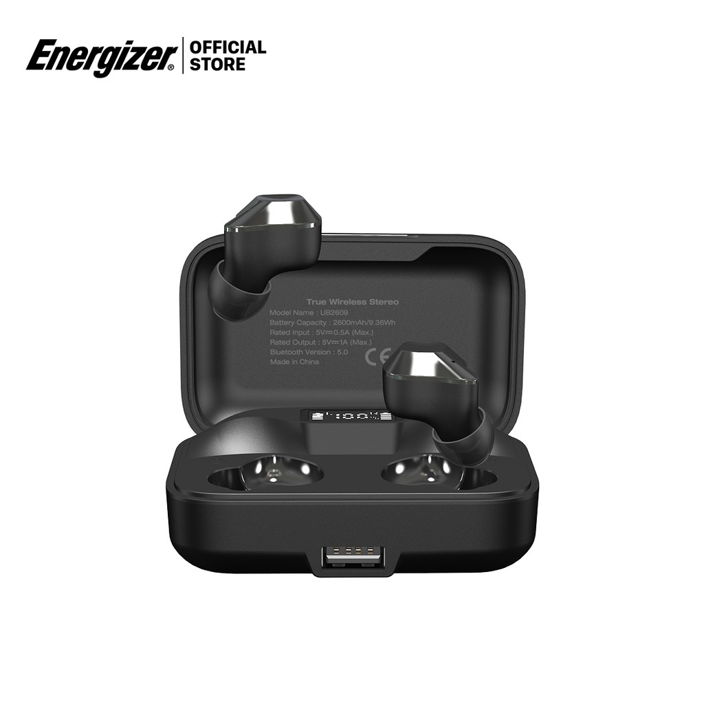 Tai nghe True Wireless Energizer UB2609 - Bluetooth V5.0, tích hợp sạc dự phòng 2600mAh, kháng nước IPX4-Hàng Chính Hãng