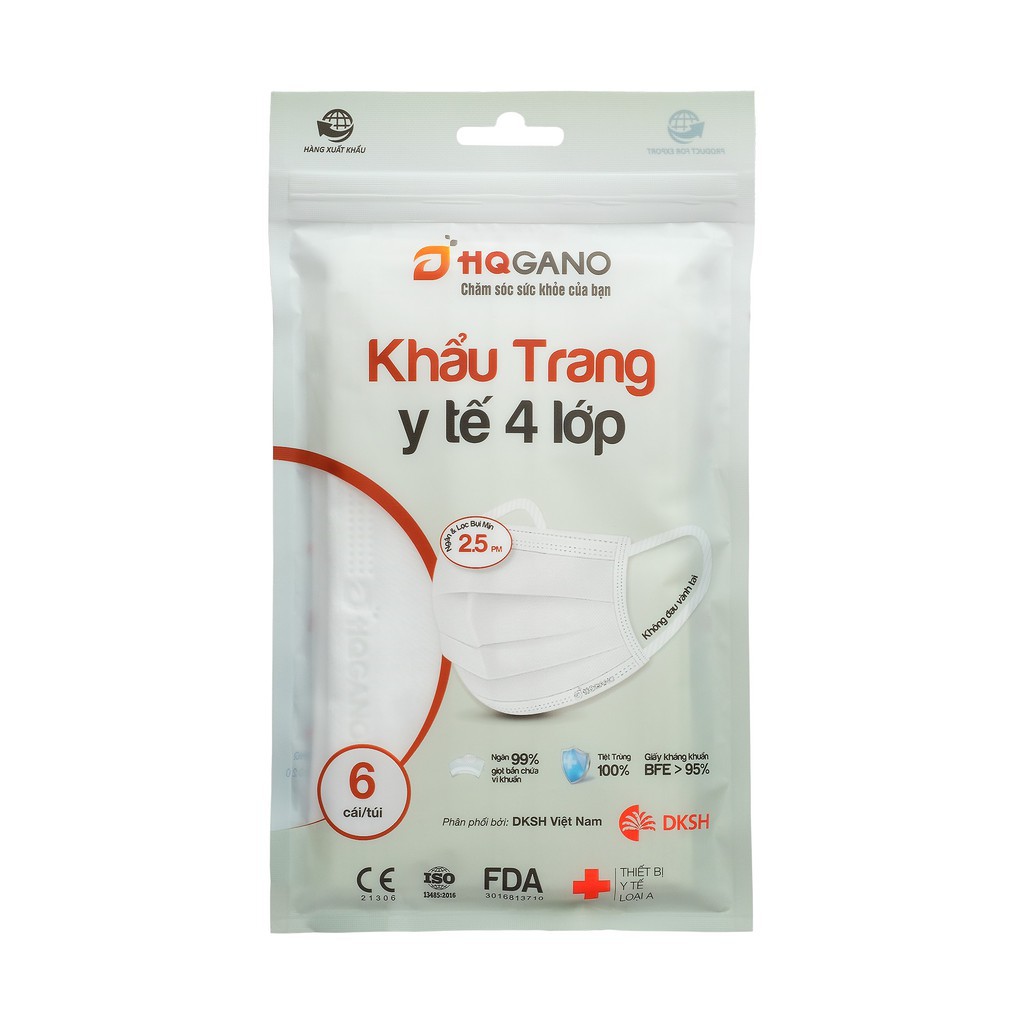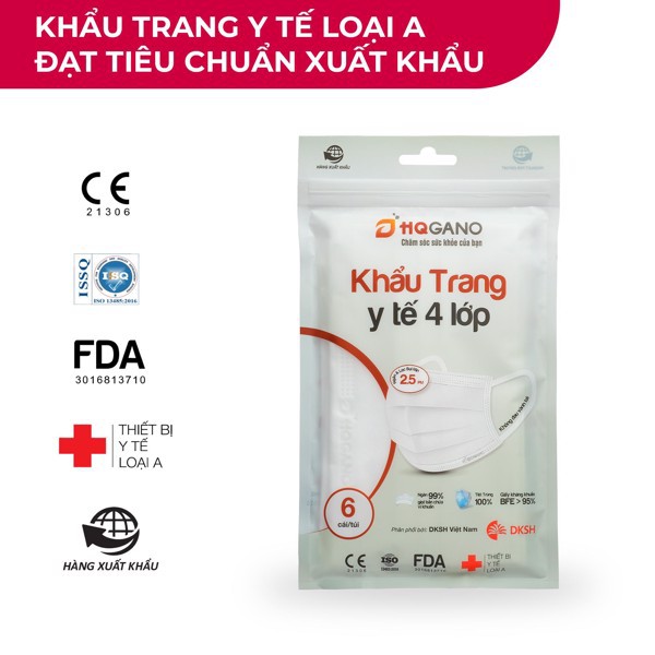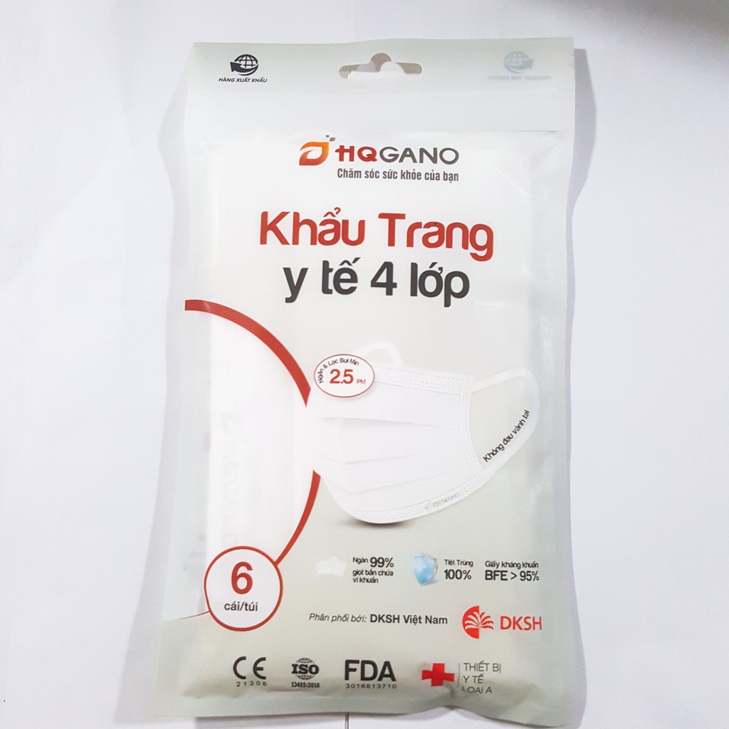 Khẩu Trang Y Tế Màu Trắng 4 Lớp HQGANO ( Túi 6 cái)