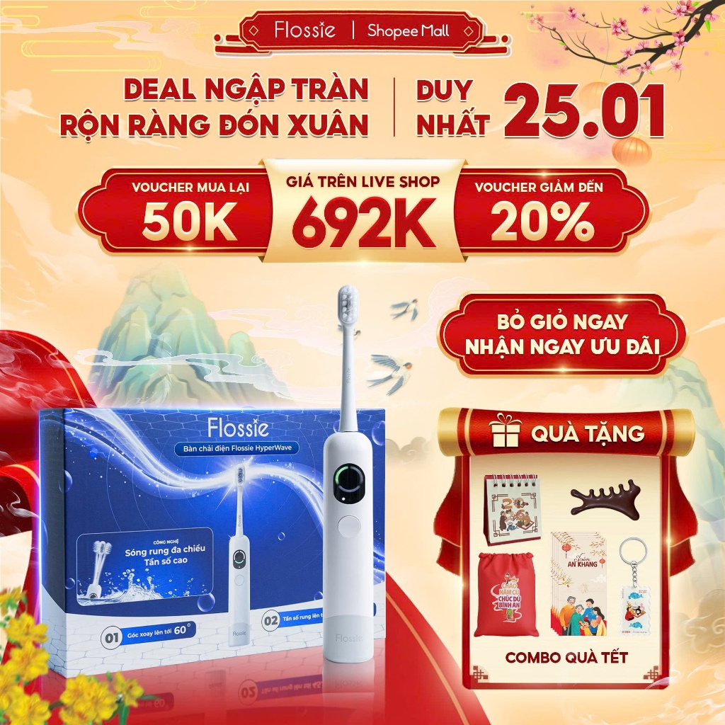 [SĂN 650K TẠI LIVE SHOP] Bàn chải điện Flossie Hyperwave Công Nghệ Rung Đa Chiều Tần Số Cao,Tích Hợp Rung và Xoay 60 độ