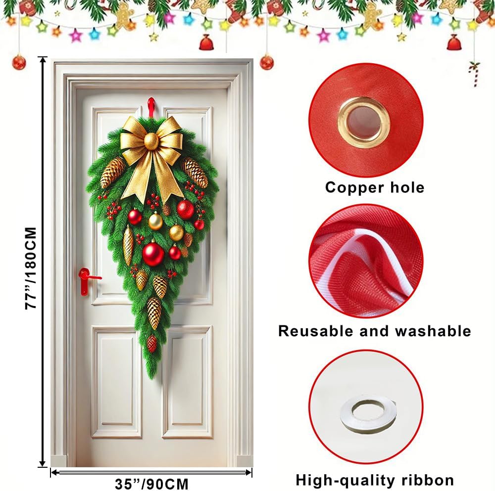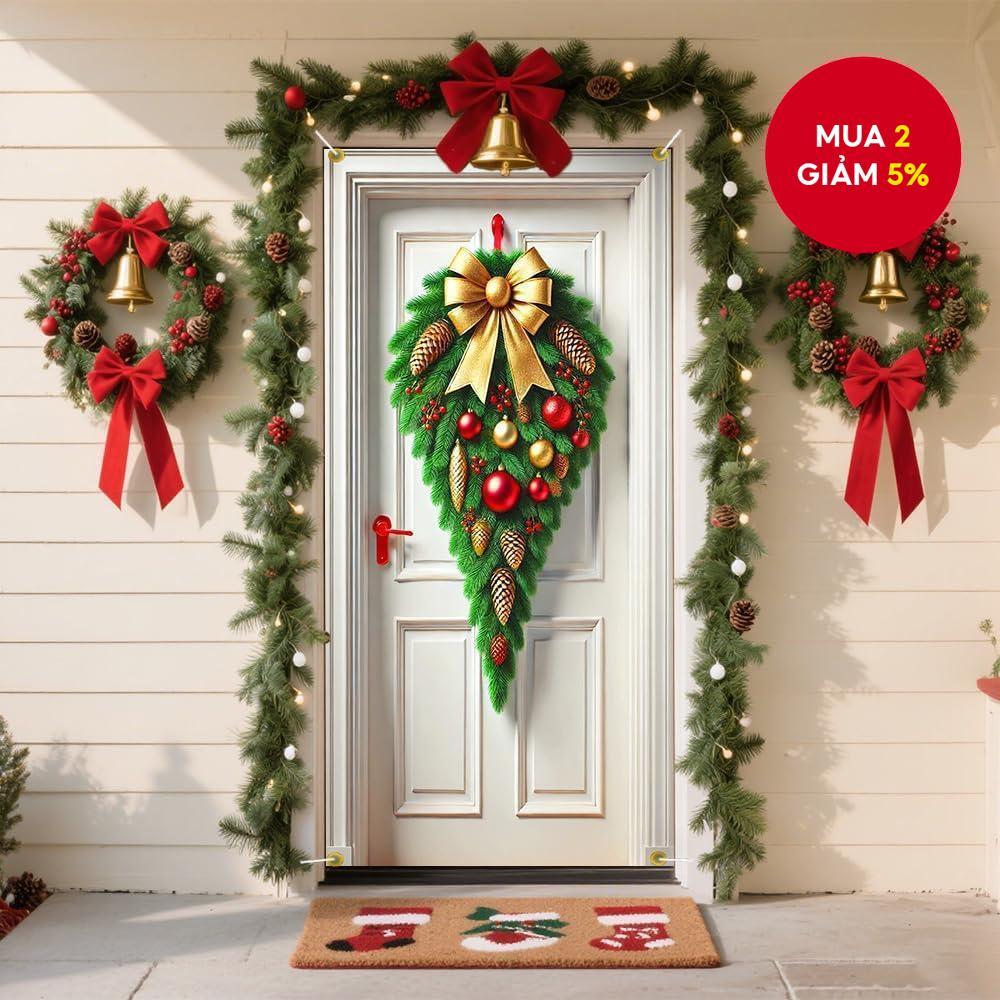 Vòng hoa Giáng sinh trang trí cửa với ruy băng vàng và chuông, kích thước 71 x 35 inch.