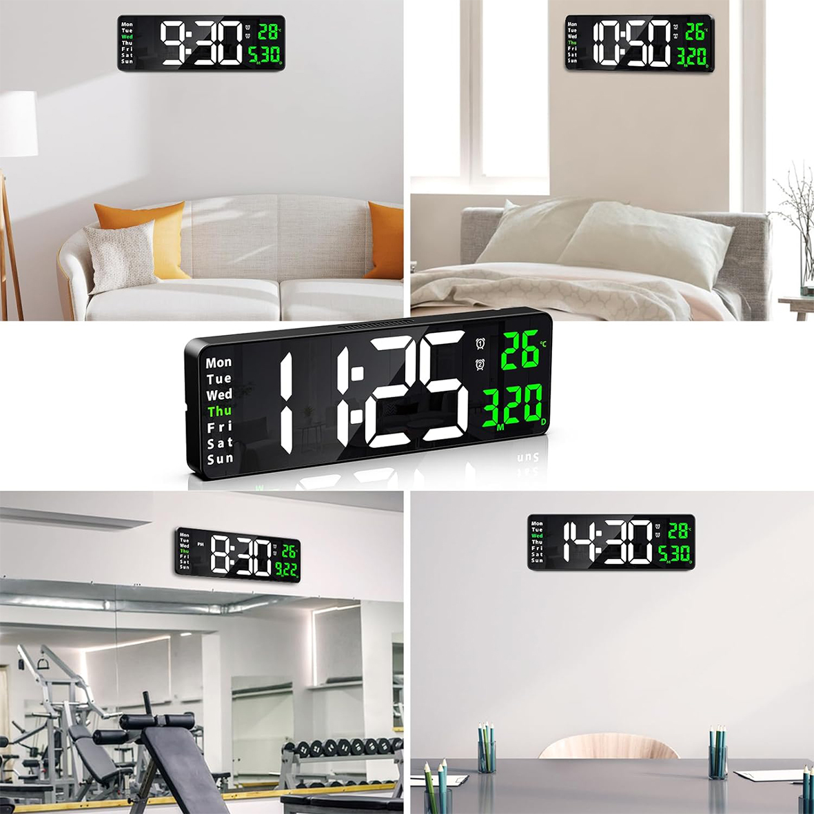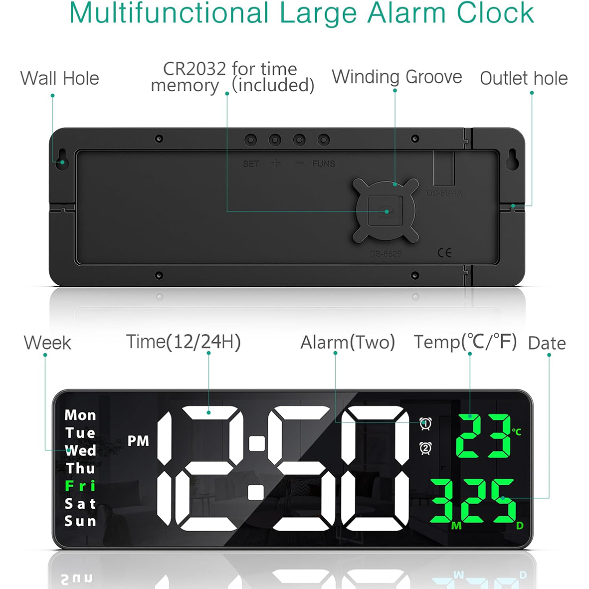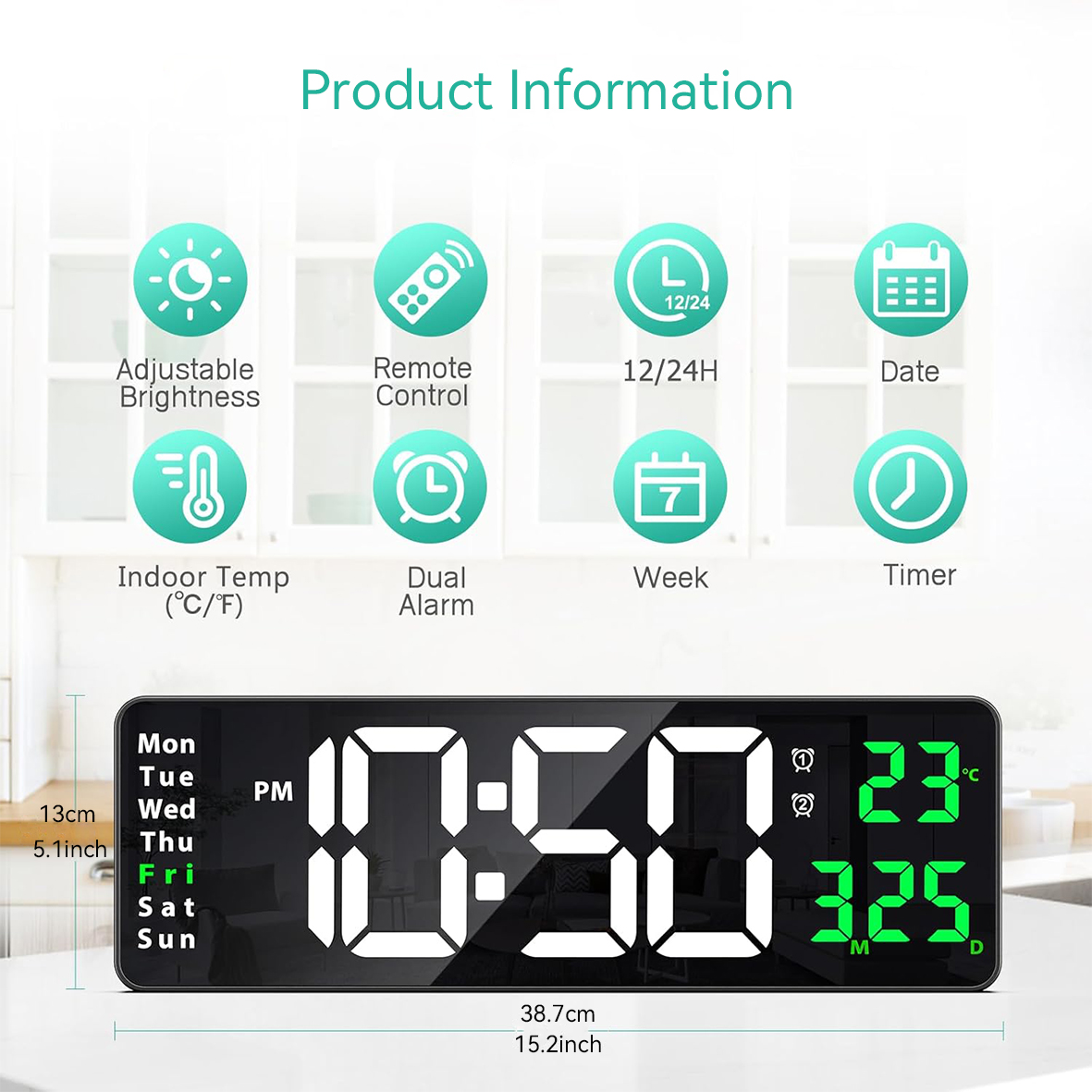 16,2 inch Đồng hồ treo tường kỹ thuật số LED xanh với điều khiển từ xa, tự động điều chỉnh độ sáng, báo thức, hiển thị ngày, nhiệt độ, tuần và định dạng giờ 12/24.
