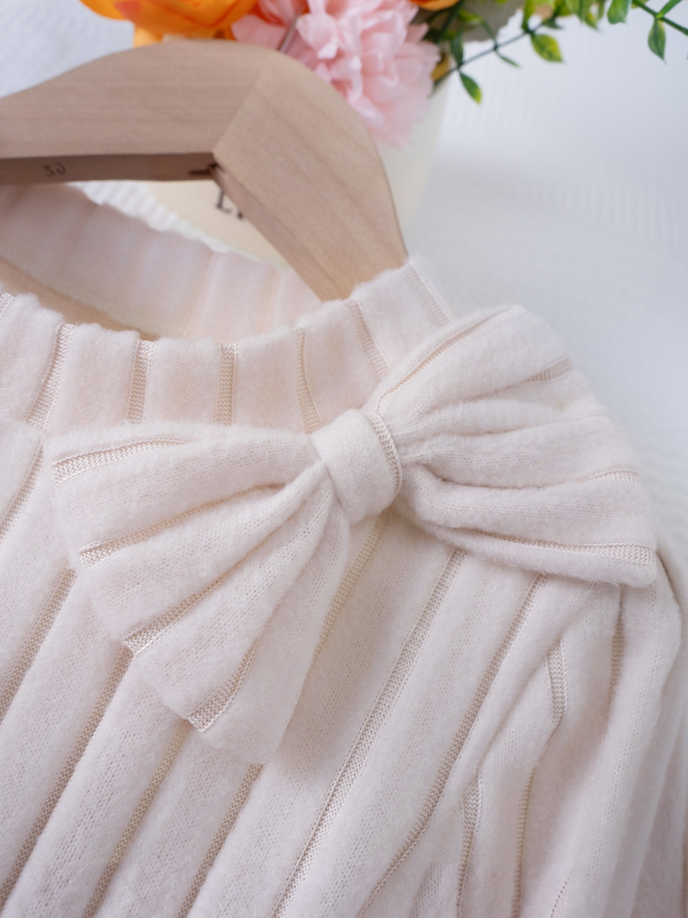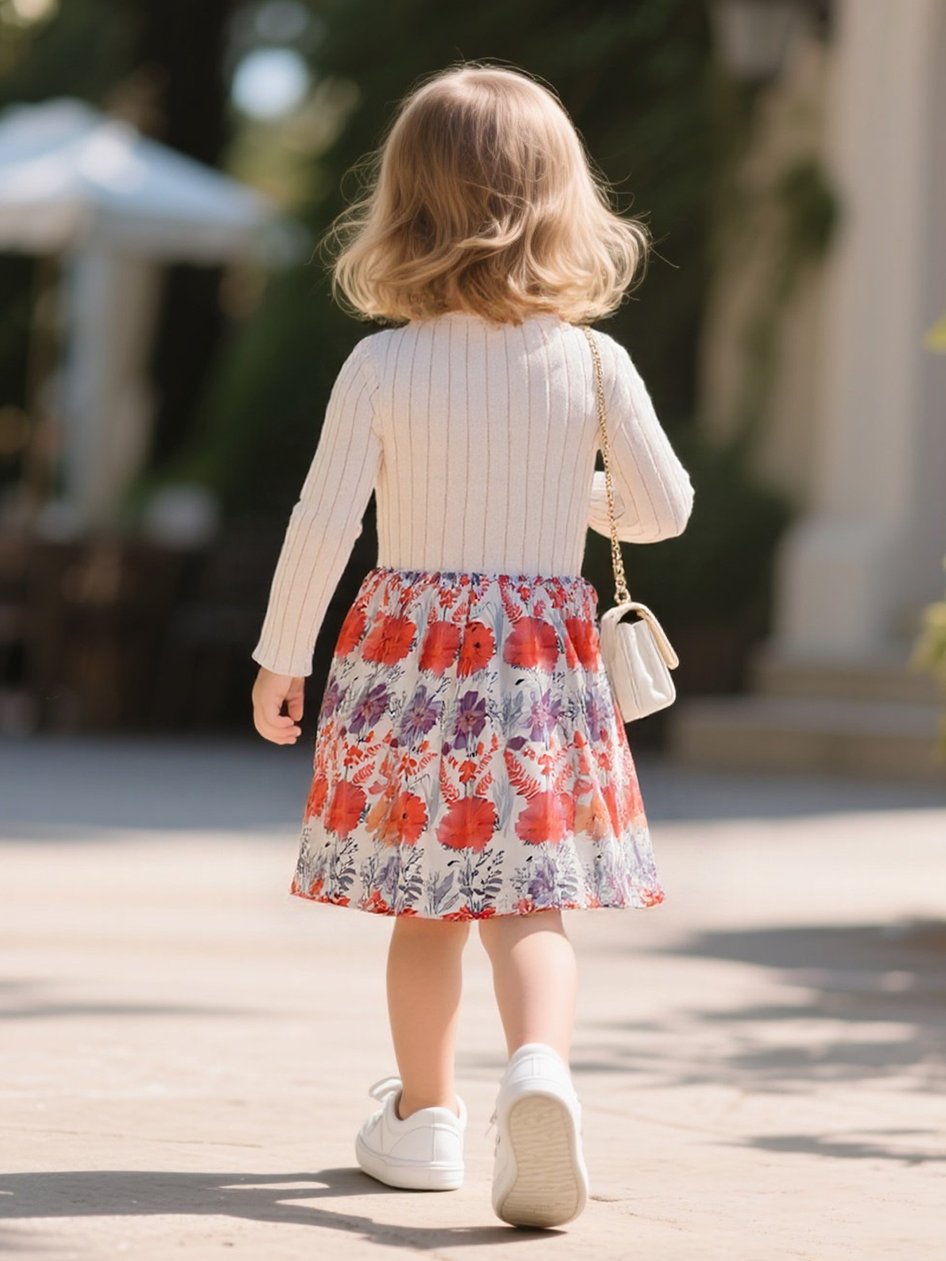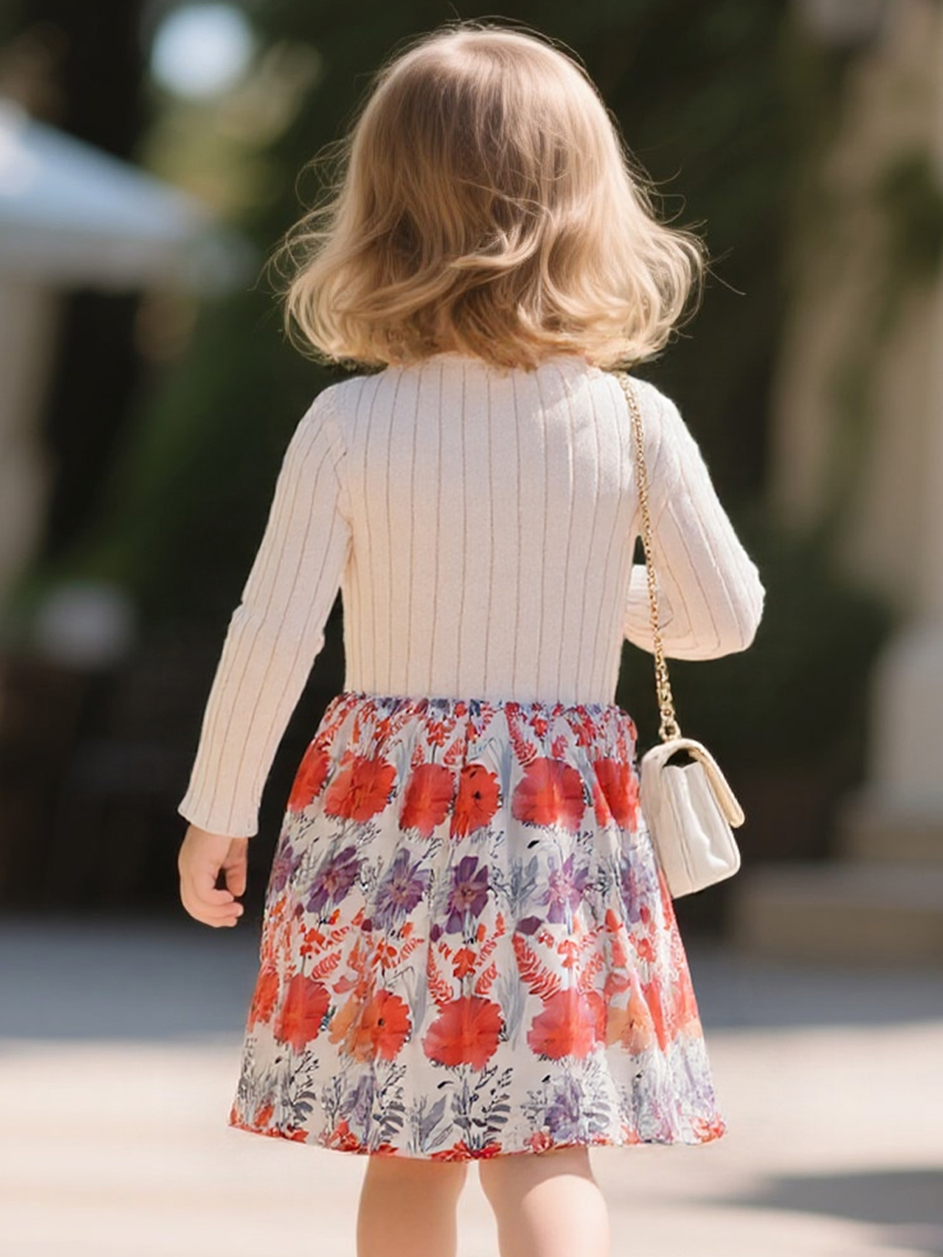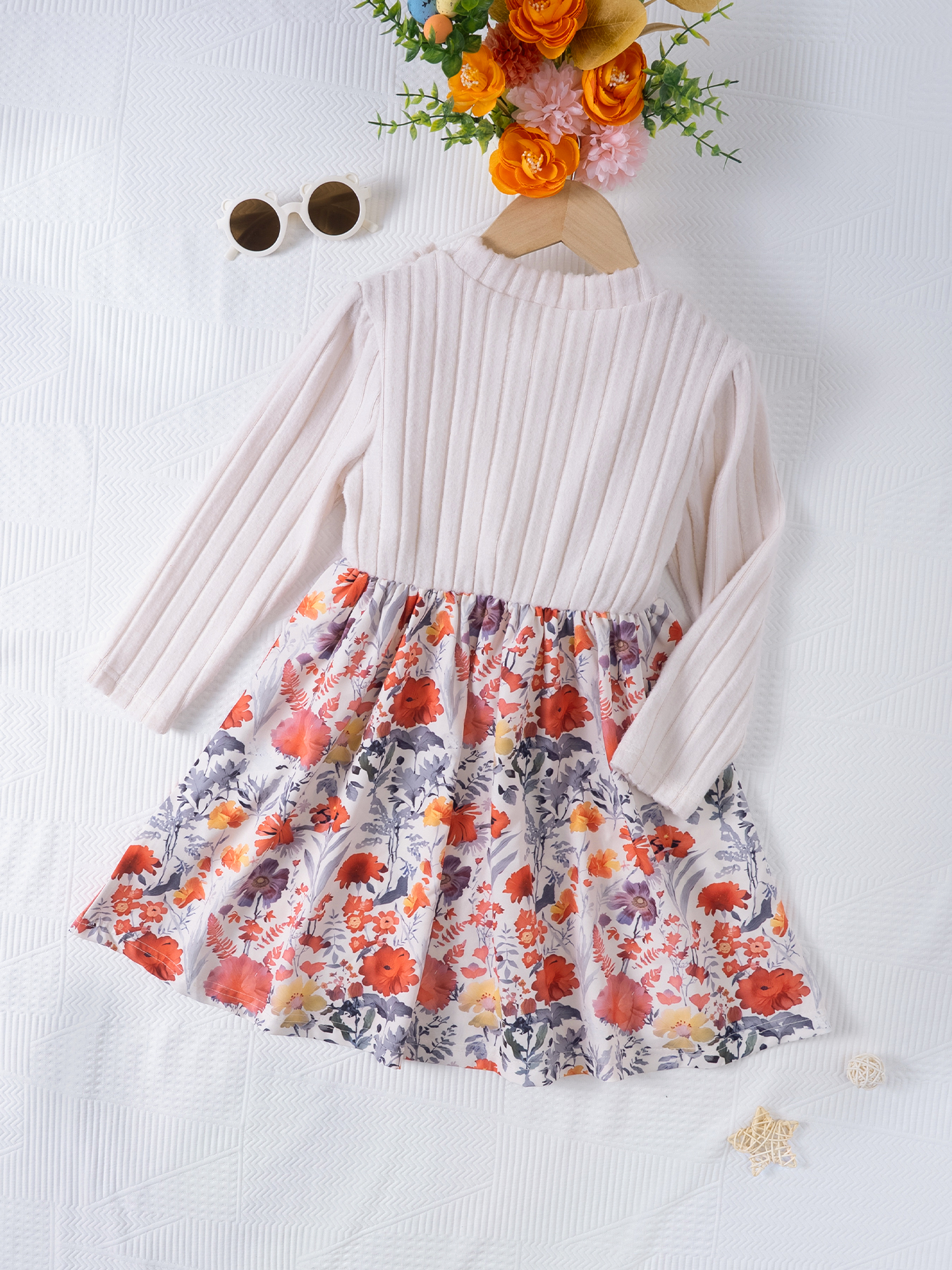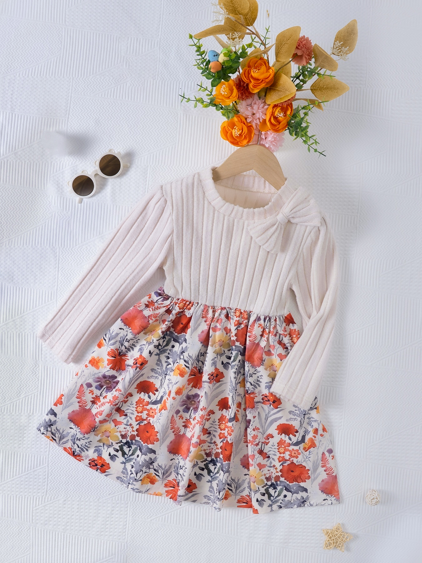 Váy bé gái có nơ và hoa văn dài tay