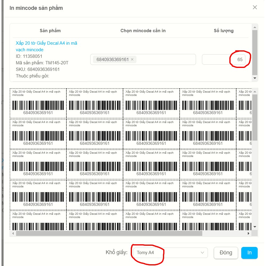 Giấy Decal A4 đã chia mảnh in mã vạch mincode, tem phụ sản phẩm Tomy